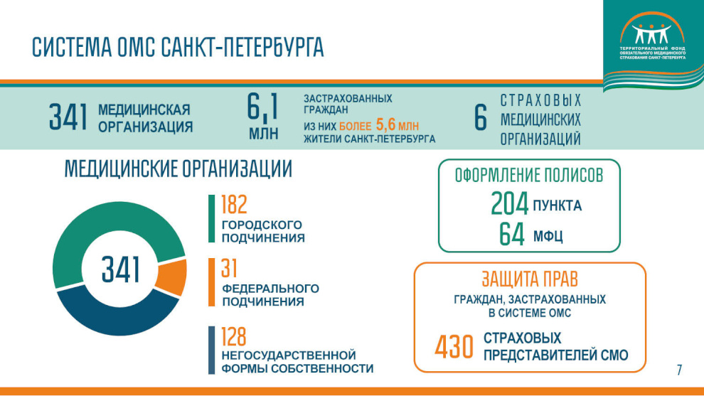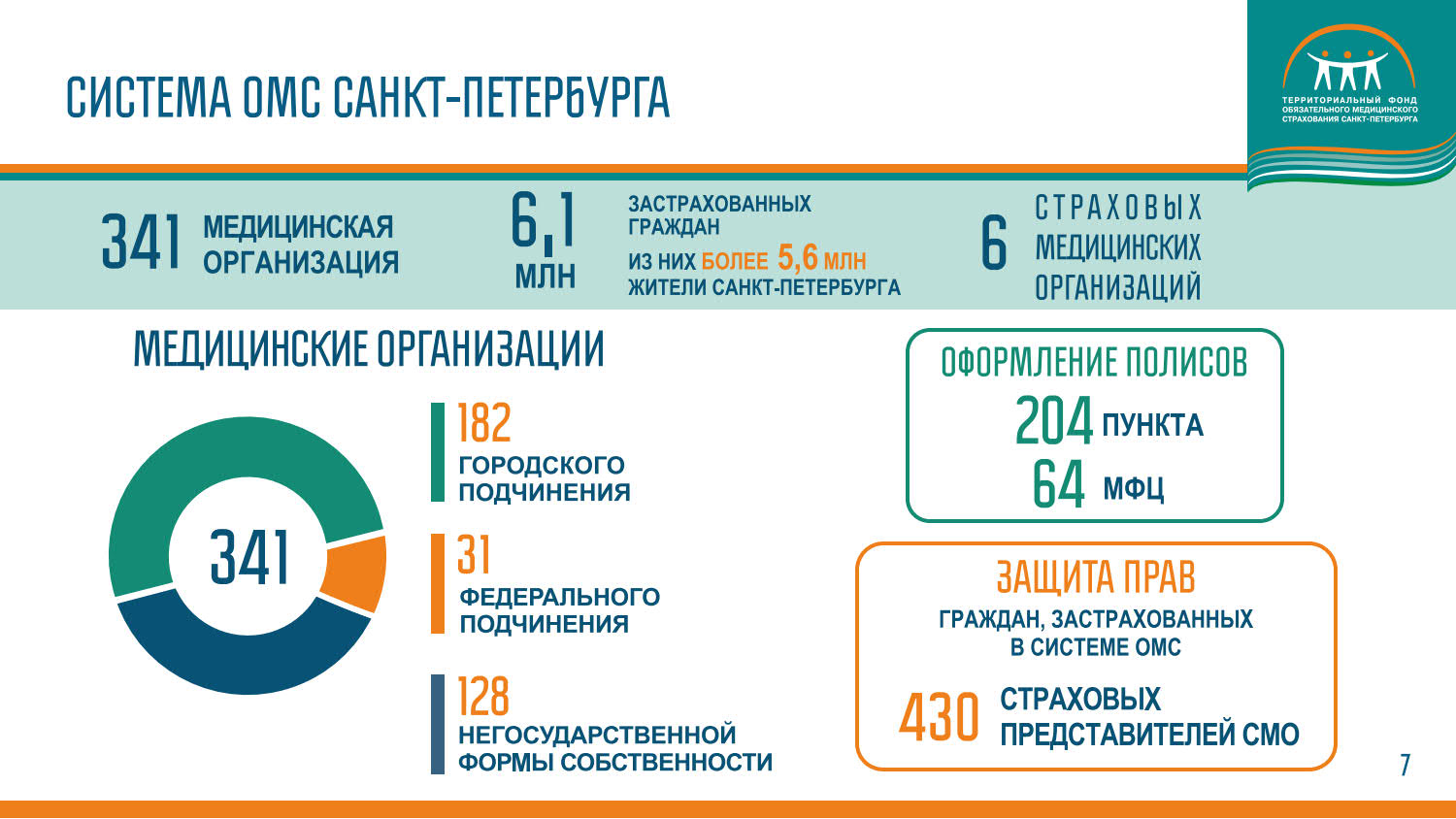 В системе обязательного медицинского страхования Санкт‑Петербурга застрахованы более 6,1 млн человек. На территории города работают 6 страховых компаний. В настоящее время медицинскую помощь оказывают 341 медицинская организация, из которых 182 - городского подчинения, 31- федерального и 128 - негосударственной формы собственности.