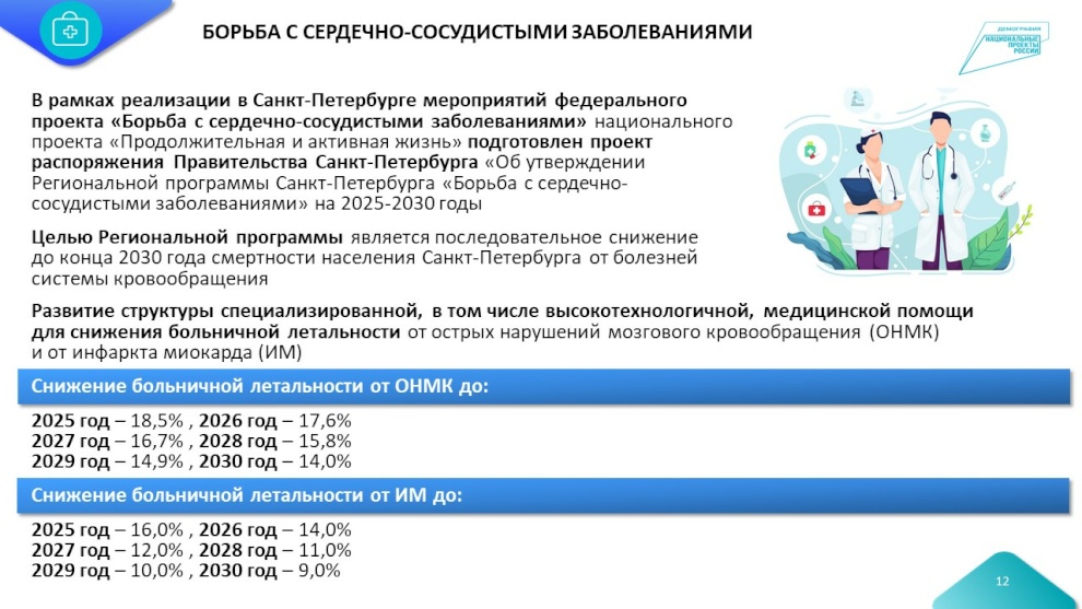 «Петербург cегодня занимает ведущие позиции в России по ожидаемой продолжительности жизни. По оперативным данным за 2024 год показатель составил более 76 лет – примерно на 3 года больше, чем в среднем по России. Это результат масштабной работы по развитию системы городского здравоохранения и социальной помощи. Сегодня мы продолжаем ее в рамках приоритетных городских проектов «Серебряный возраст», «Здоровье петербуржцев» и других», – сказал Александр Беглов.