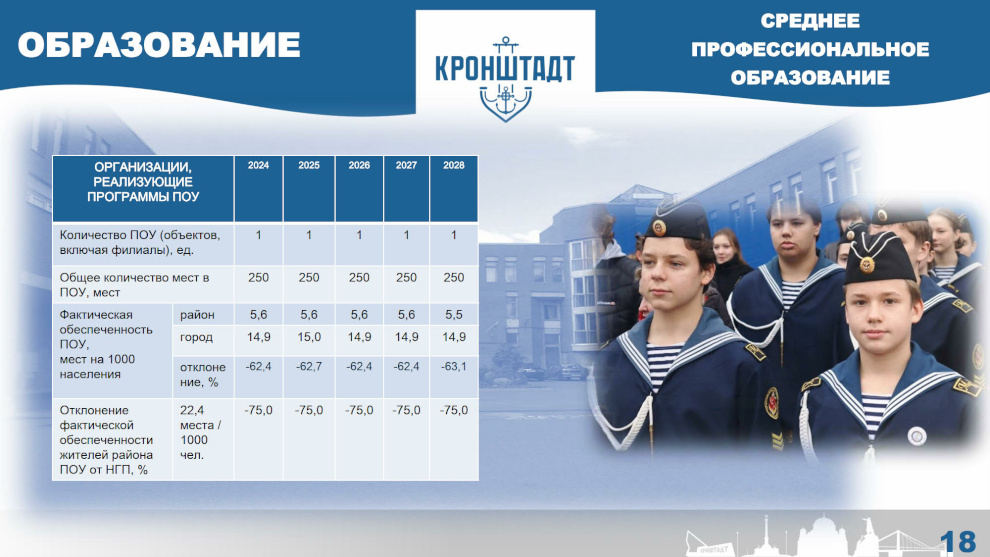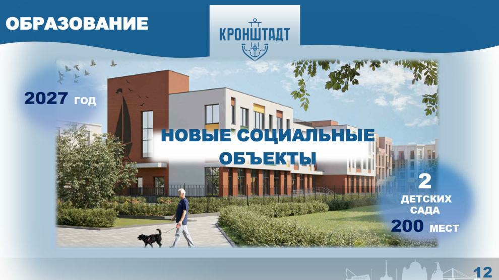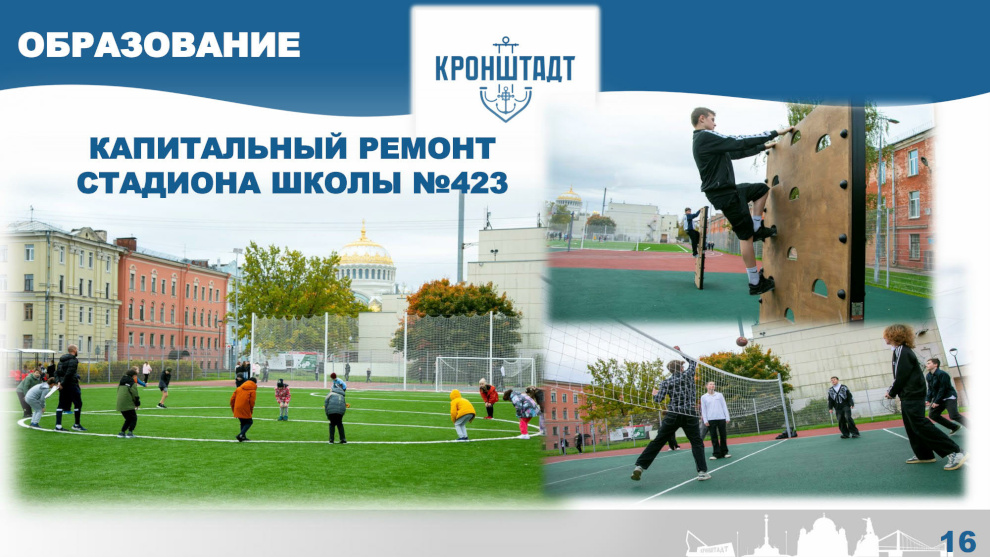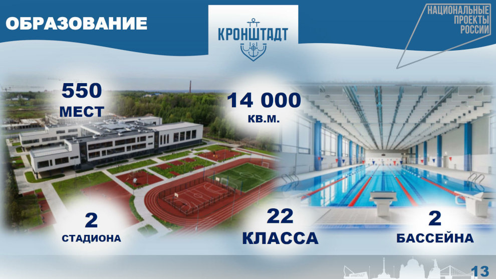 В этом году открыт новый современный корпус школы №425 имени академика Капицы на 550 мест. Он построен по «петербургскому стандарту» – в здании оборудованы бассейны, два спортивных зала, просторный атриум. Юные жители Кронштадта получили библиотеку с читальным залом, актовый зал со сценой, мастерские для занятий шитьём, обработкой металла и дерева.