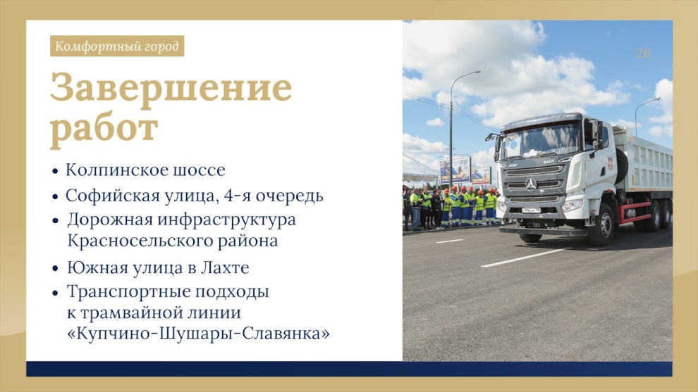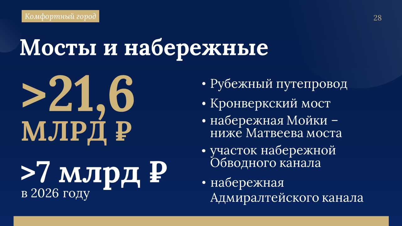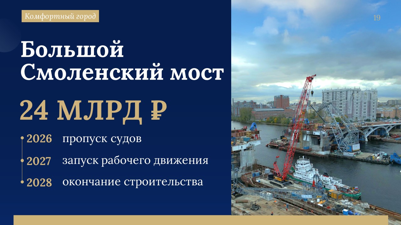 По словам Александра Беглова, строительство Большого Смоленского моста идёт с существенным опережением графика. В 2027 году планируется открыть рабочее движение, в 2028 году - завершить объект досрочно. На эти цели в проекте бюджета предусмотрено 24 миллиарда рублей.