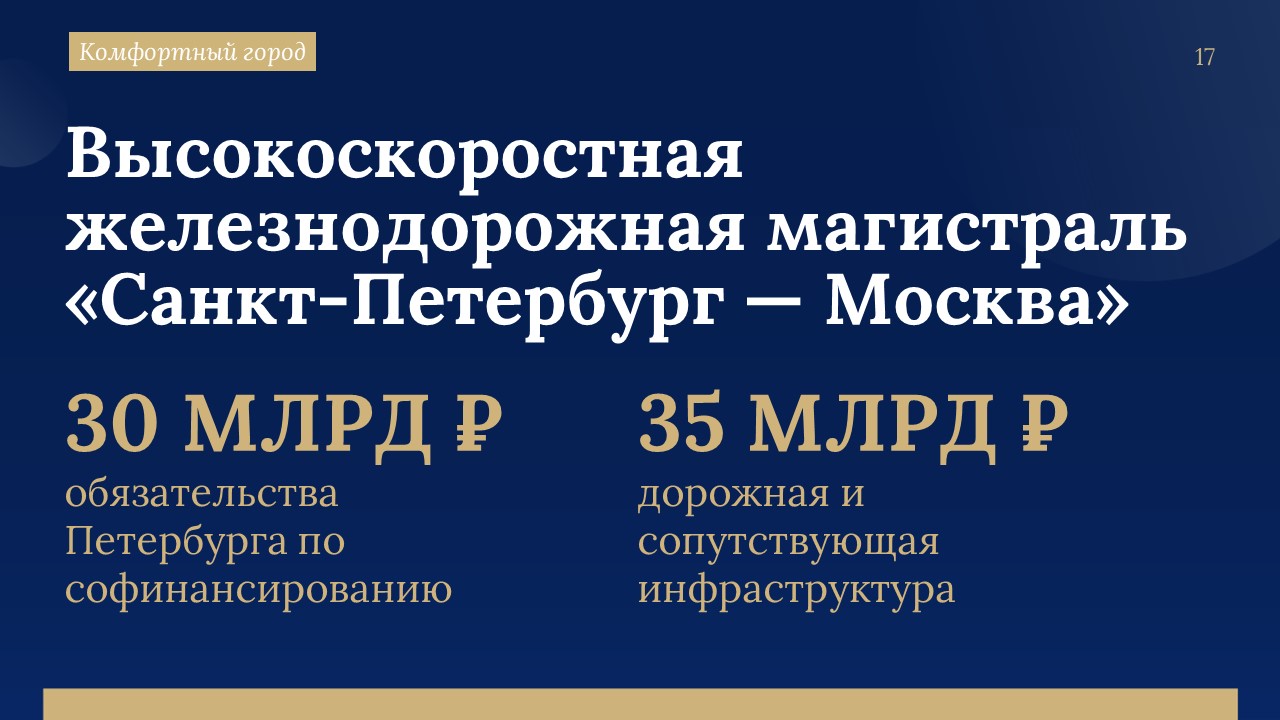 На строительство следующих этапов ШМСД в проекте трёхлетнего бюджета заложено 94 миллиарда рублей, в том числе 27,5 миллиарда федеральных средств. Всего по поручению Президента России Владимира Путина на этот объект Петербургу будет выделено 90 миллиардов рублей.