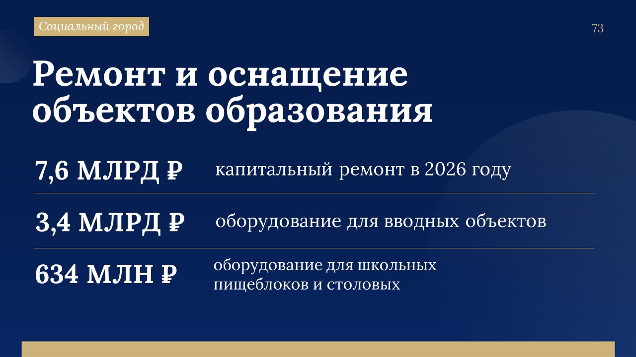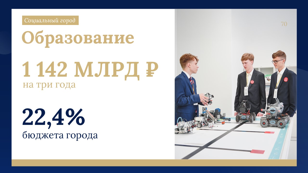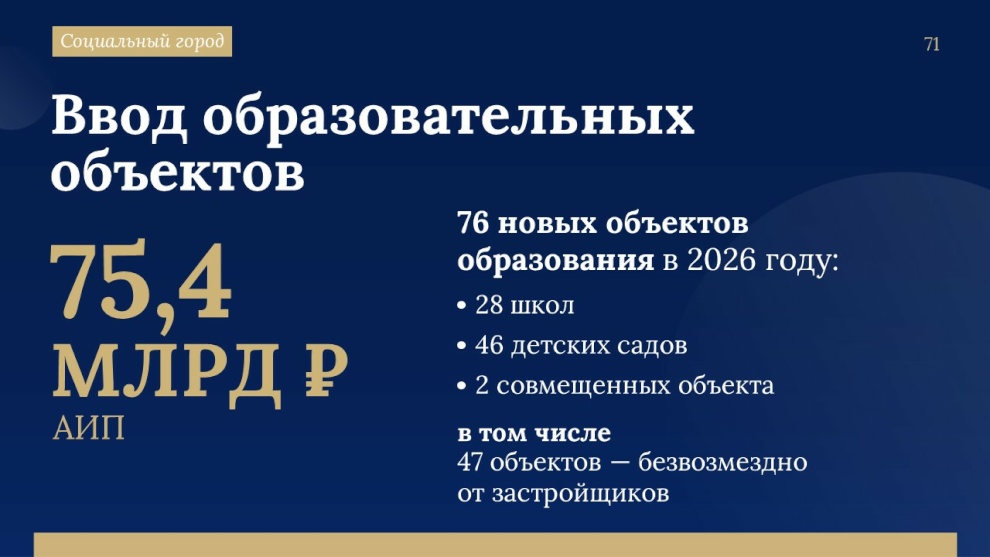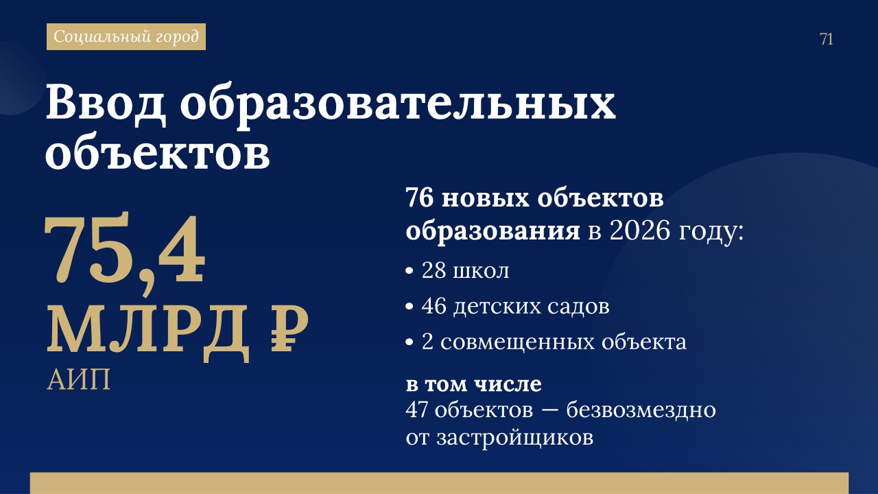 «В Адресную инвестиционную программу на объекты образования проектом бюджета заложено 75,4 миллиарда рублей. Часть объектов безвозмездно передадут застройщики по действующим правилам ввода жилья», – сказал глава Северной столицы.