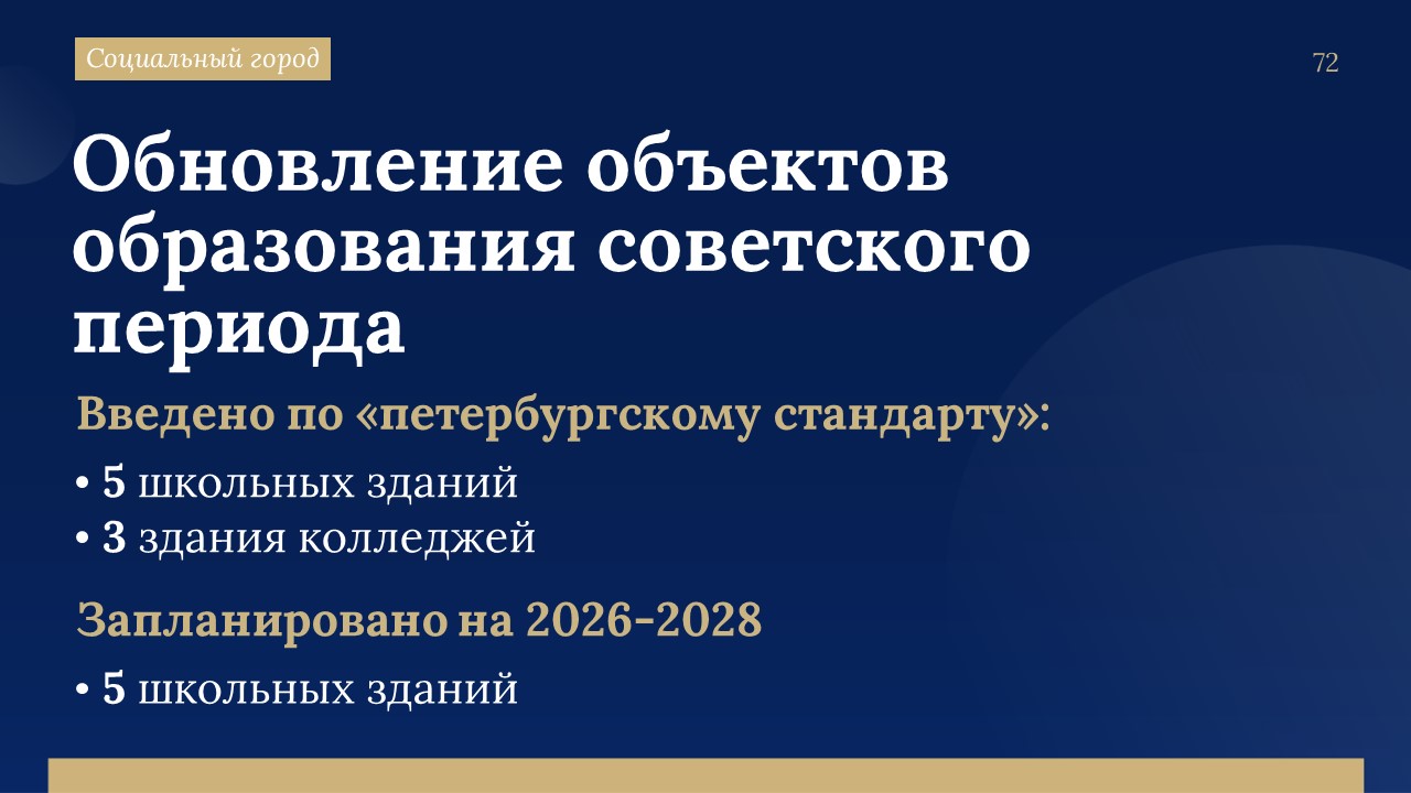 Он напомнил, что в Петербурге стартовала большая программа обновления советских школ и детских садов. Многие из них настолько исчерпали свой ресурс, что целесообразно их снести и построить на их местах новые корпуса по «петербургскому стандарту».