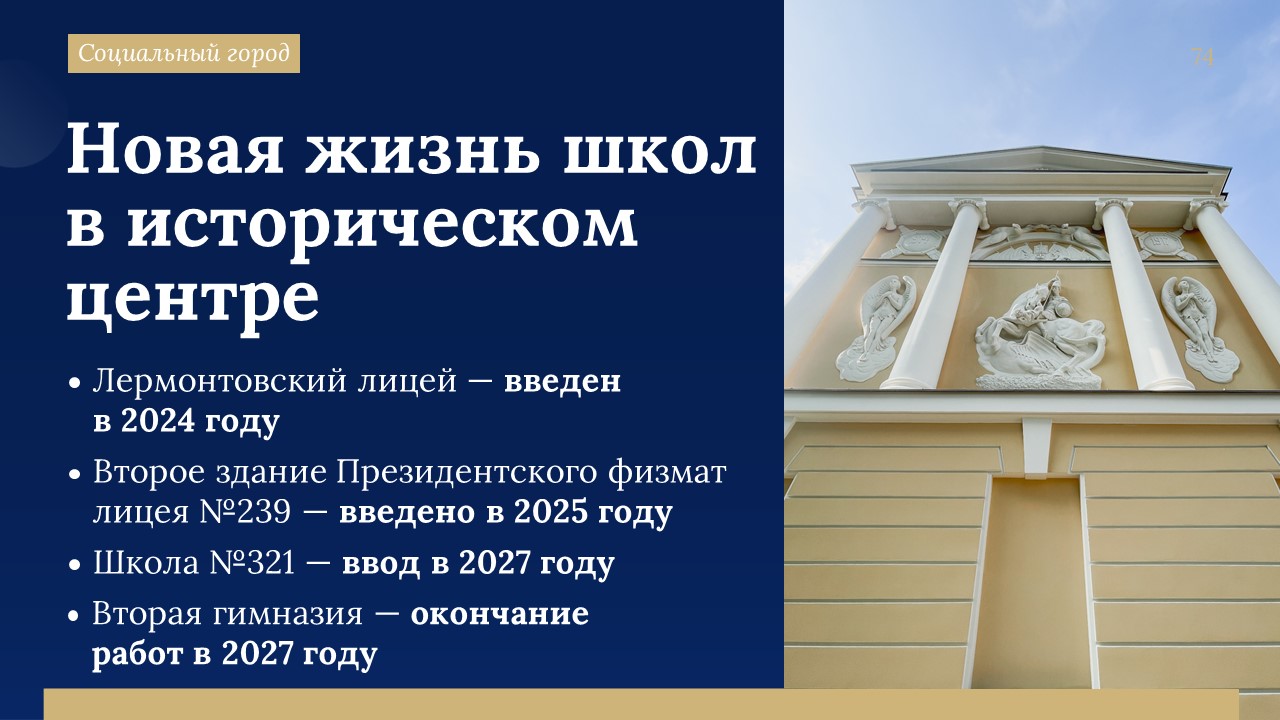 «В 2027 году завершим ремонт ещё двух знаковых площадок. Это школьные здания, которые были построены в нашем городе ещё в начале 19 века – Вторая гимназия и школа №321», – сообщил Александр Беглов.