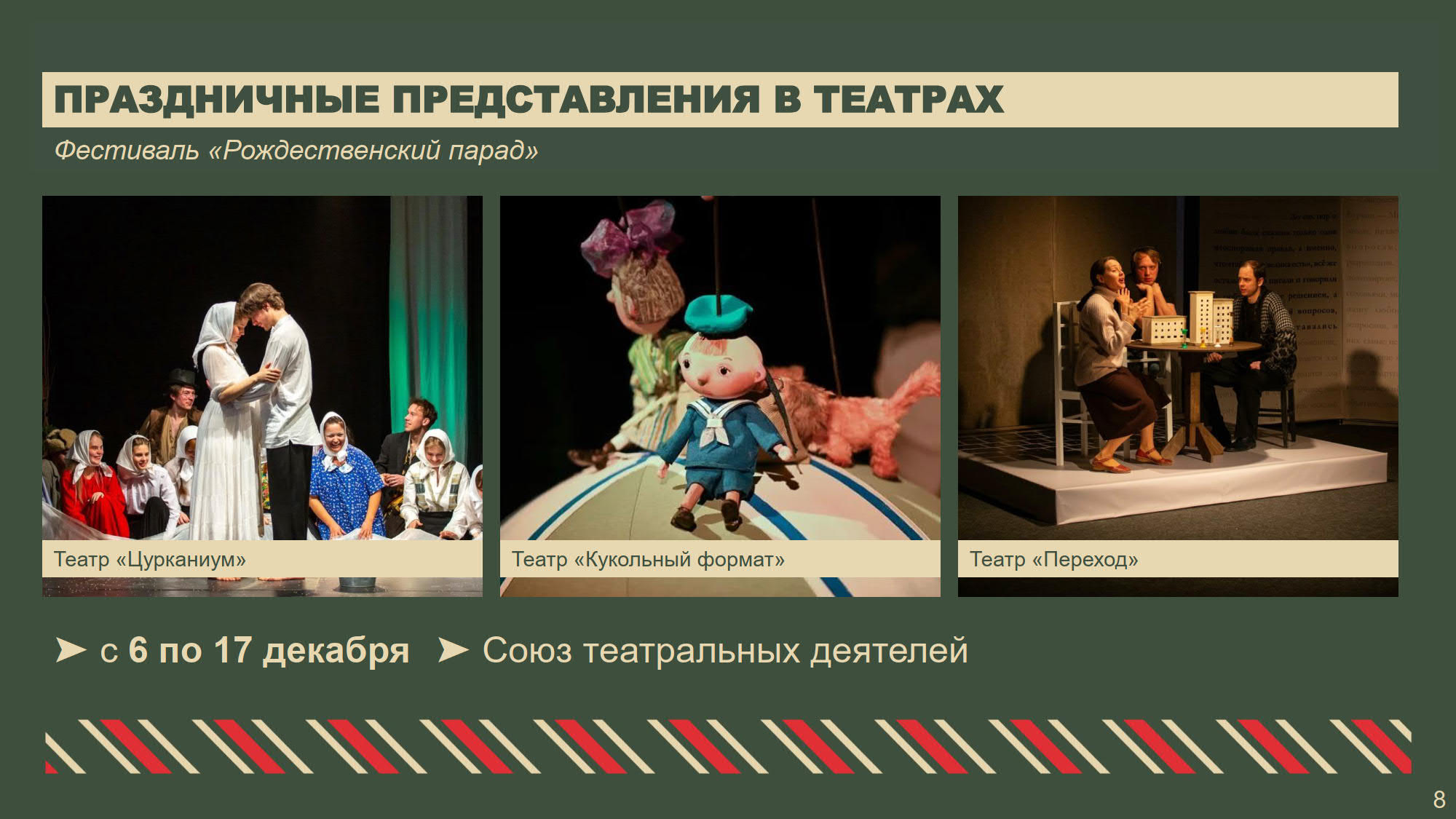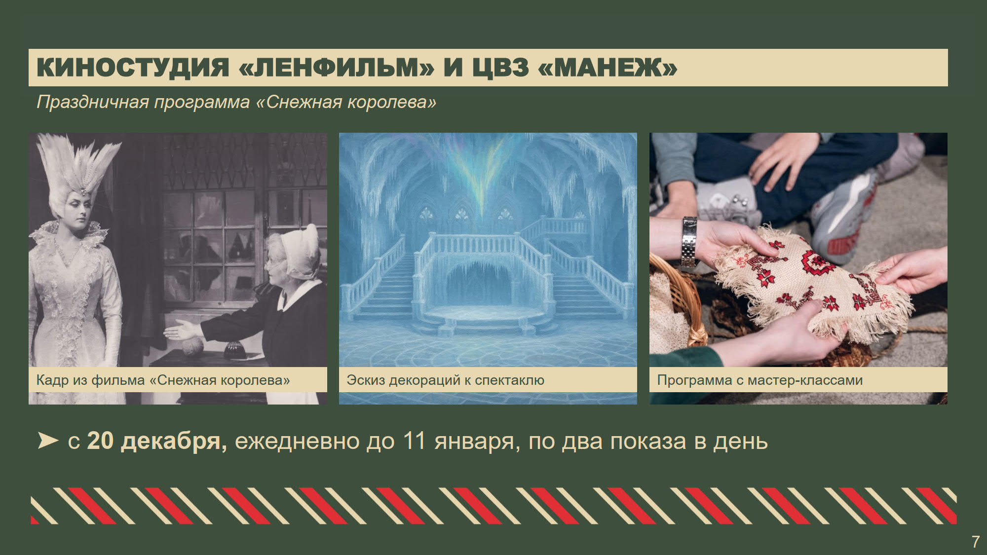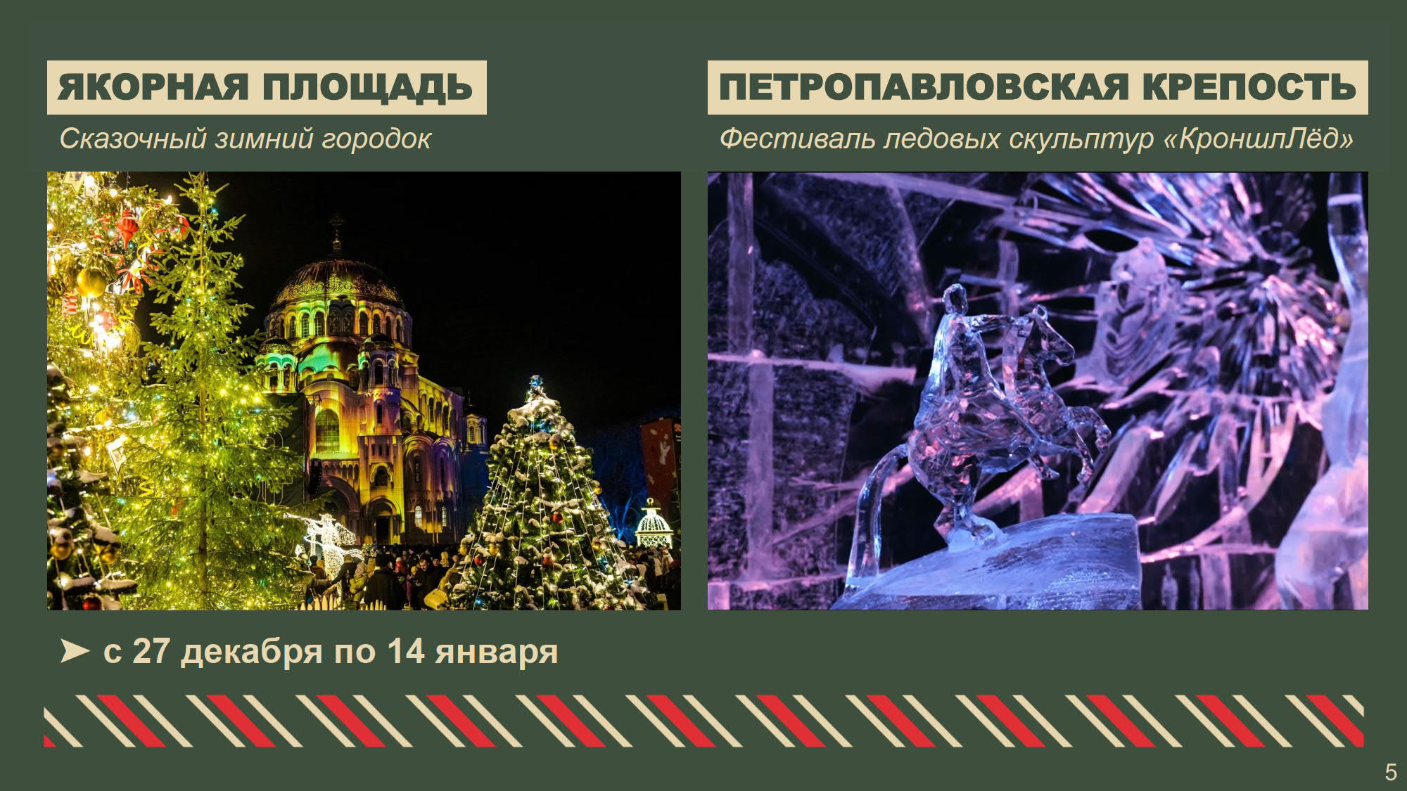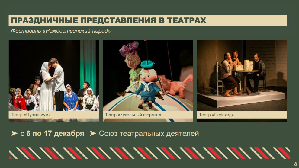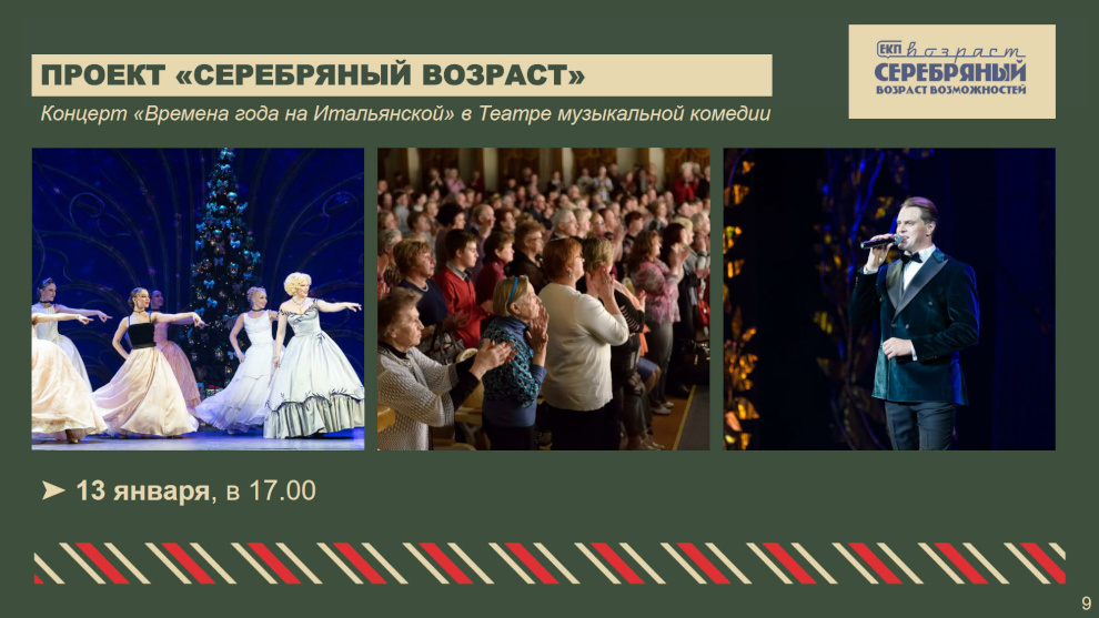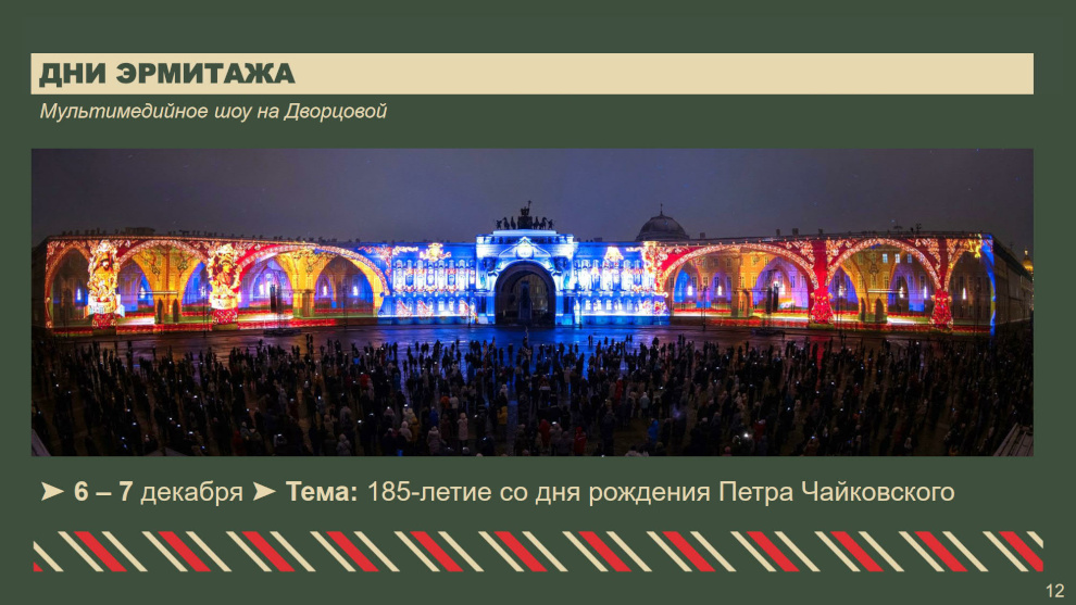 В театрах, музеях и концертных залах Петербурга состоятся интерактивные программы и новогодние представления для детей и взрослых. В Таврическом дворце пройдет «Рождественская ёлка» для детей участников специальной военной операции. В рамках приоритетного проекта «Забота о людях серебряного возраста» для старшего поколения будет организован концерт «Времена года на Итальянской» в Театре музыкальной комедии. Во всех районах пройдут праздничные мероприятия, концерты для ветеранов и блокадников. В Московском районе в новом музейном пространстве «Книги блокадного города», открытом в год 80-летия Великой Победы, подготовлены интерактивные экскурсии — посетителям расскажут, как встречали Новый год в блокадном Ленинграде.