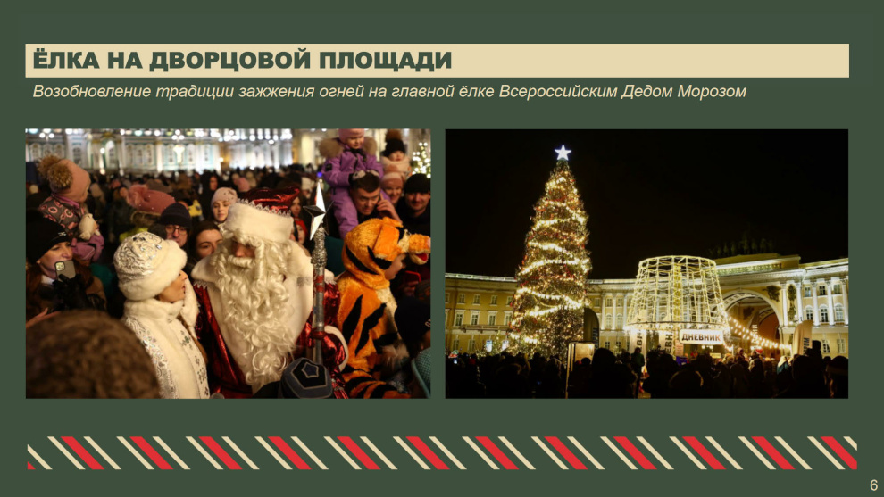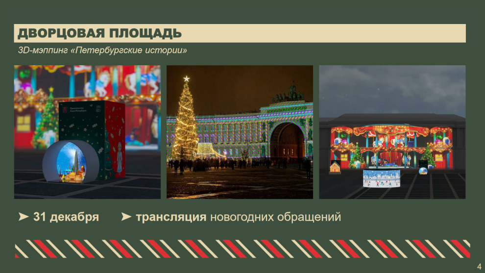 «В прошлом году Петербург на новогодние праздники посетили 1,2 миллиона туристов — на 14% больше, чем годом ранее. Наших гостей привлекает яркая и масштабная праздничная программа. Самое важное — создать радостное настроение у всех, кто будет отмечать новогодние праздники в нашем городе. Сделать это — наша общая ответственность»,— сказал Александр Беглов.