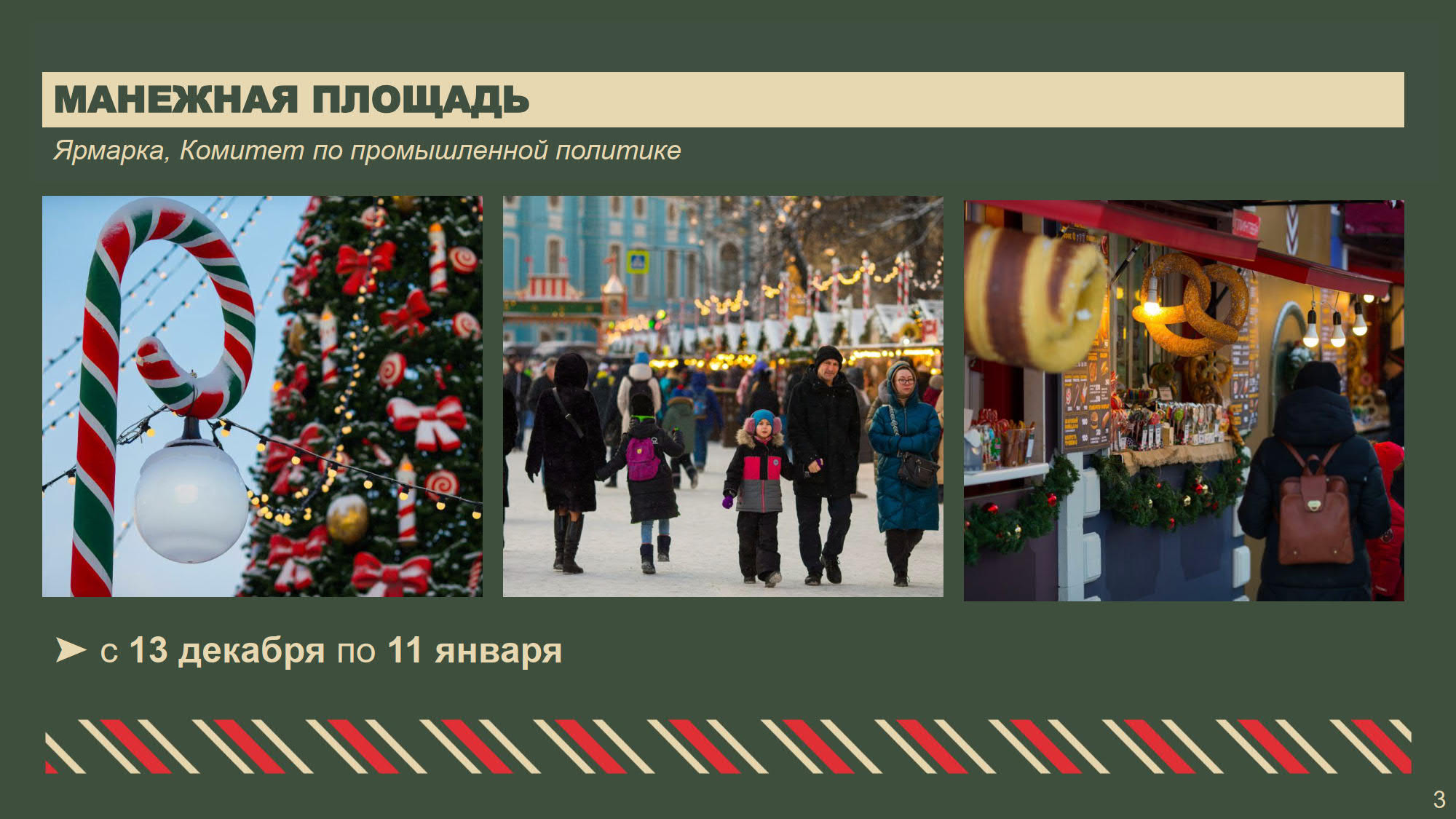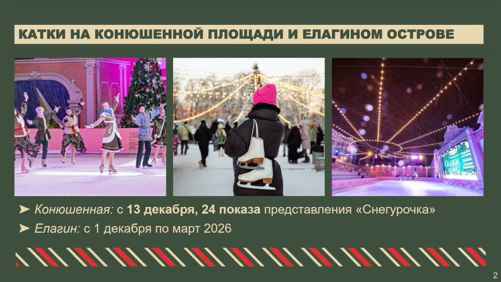 На Конюшенной площади с 13 декабря откроется ледовый каток, на Манежной, Московской и Дворцовой площадях будет работать XX Рождественская ярмарка. В прошлом году ее посетили почти полтора миллиона человек, приняли участие производители из 17 регионов страны. В этом году ярмарка продлится с 13 декабря 2025 года по 11 января 2026 года. Производителям предоставят 136 торговых мест.