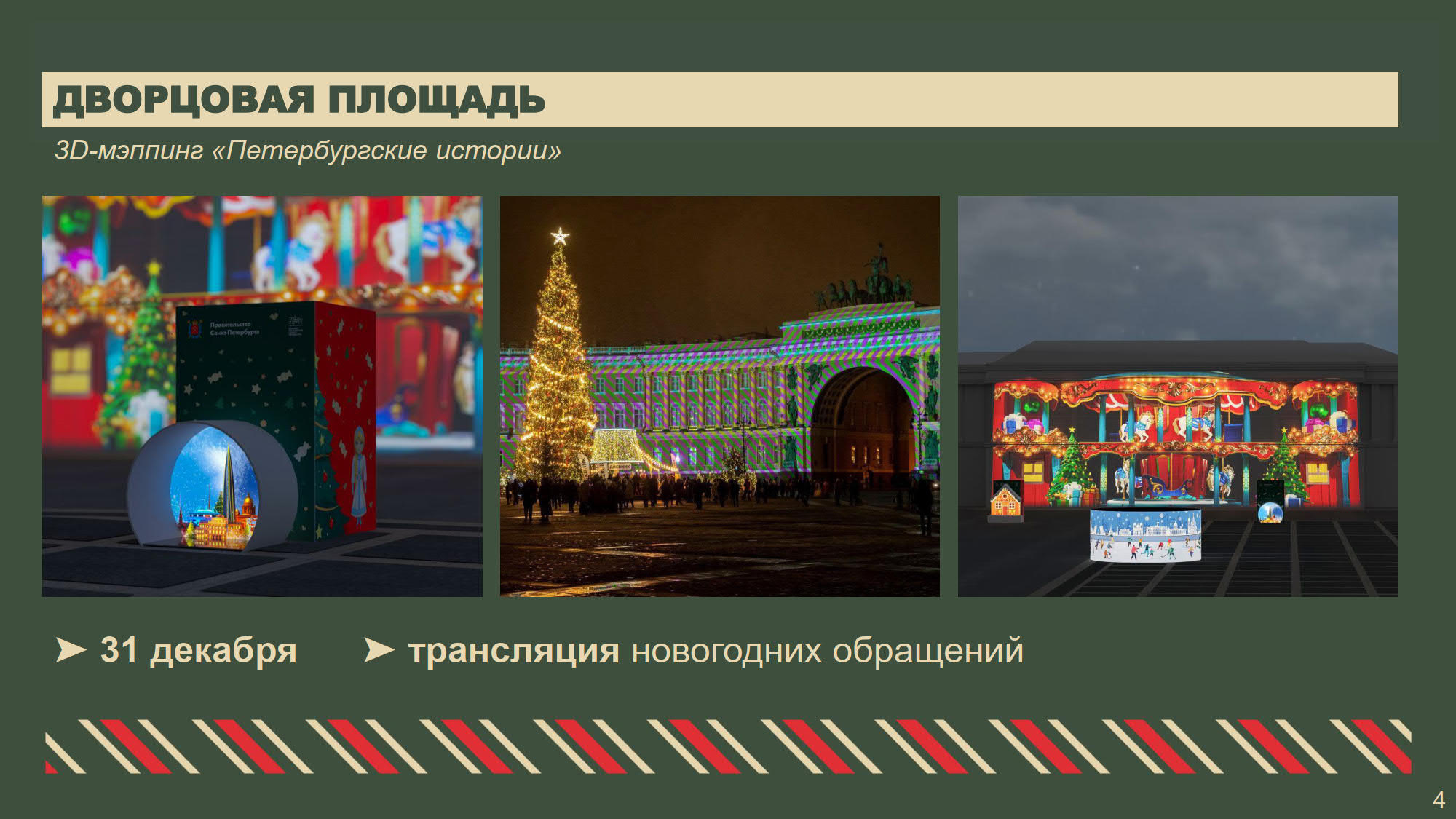 Центром торжеств по традиции станет Дворцовая площадь. 13 декабря здесь откроется главная Рождественская горка, а 20 декабря установят главную городскую ёлку. Ее привезут её из Копорского лесничества Ленинградской области. Также на этот день на Дворцовую площадь пожалует Всероссийский Дед Мороз, который торжественно зажжет огни на главной елке города.