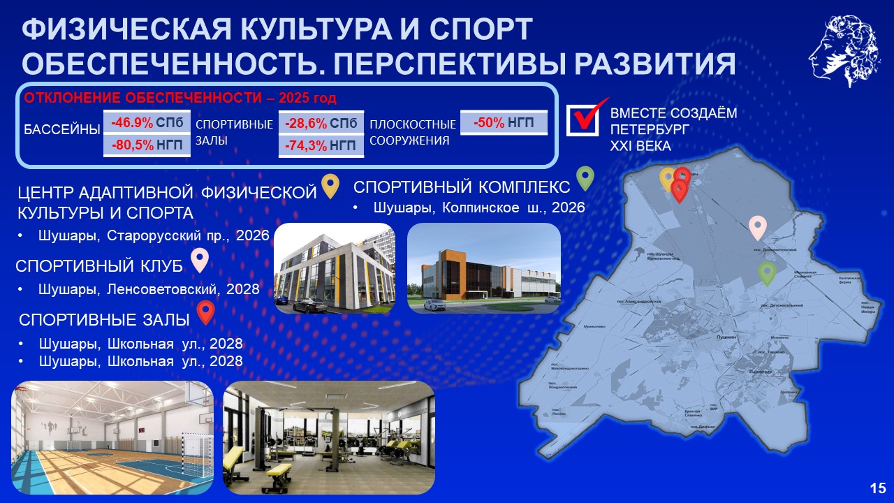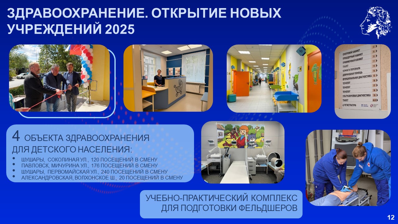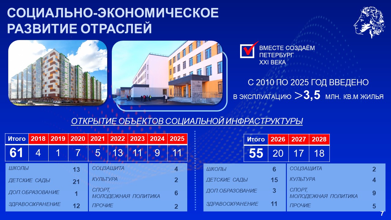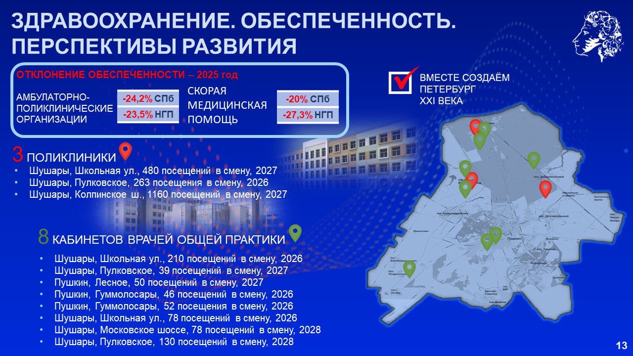 Губернатор напомнил, что только в прошлом году были открыты 3 школы, 2 детских сада, 4 объекта здравоохранения. Уже в этом году в Шушарах ввели школу почти на 2 тысячи мест и детский сад на 440 мест. До 2028 года планируется ввести в Пушкинском районе ещё 55 объектов, среди которых 6 школ, 15 детских садов, 11 медицинских объектов и 6 спортивных объектов.