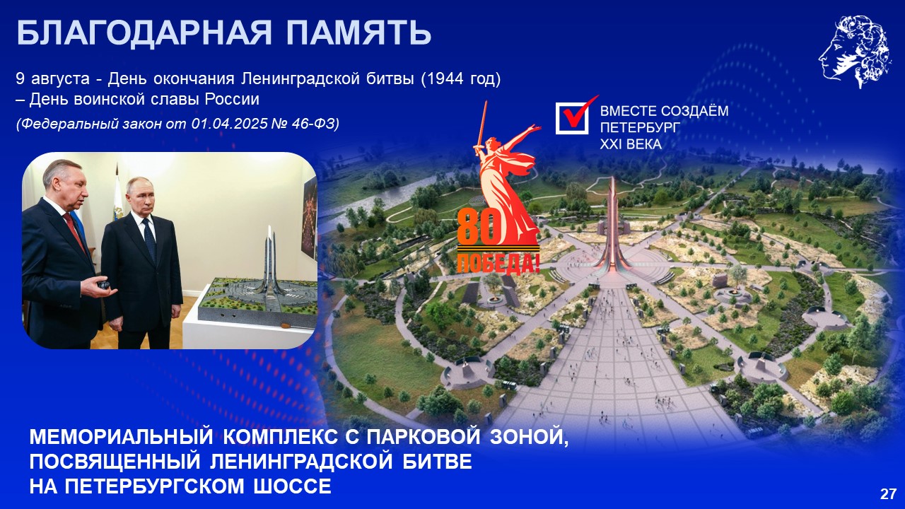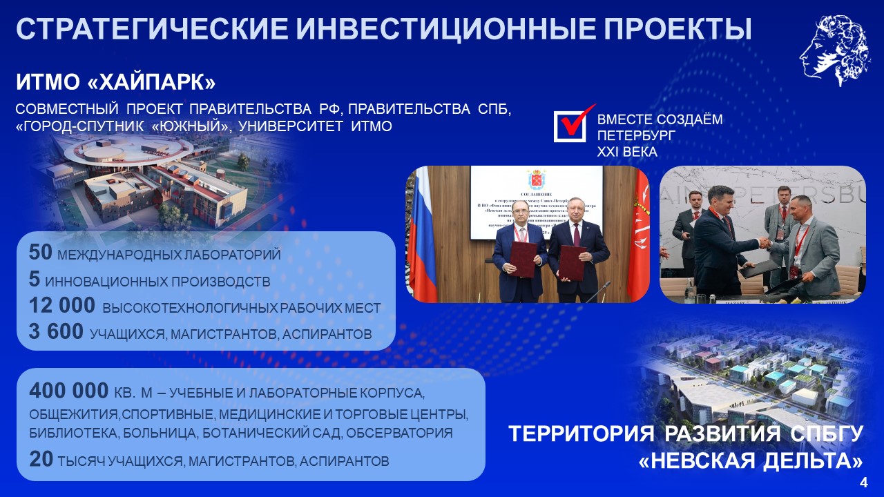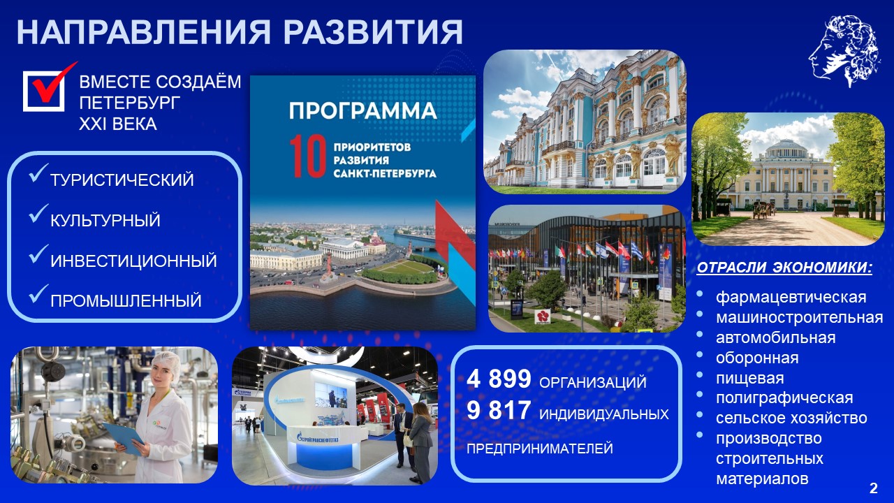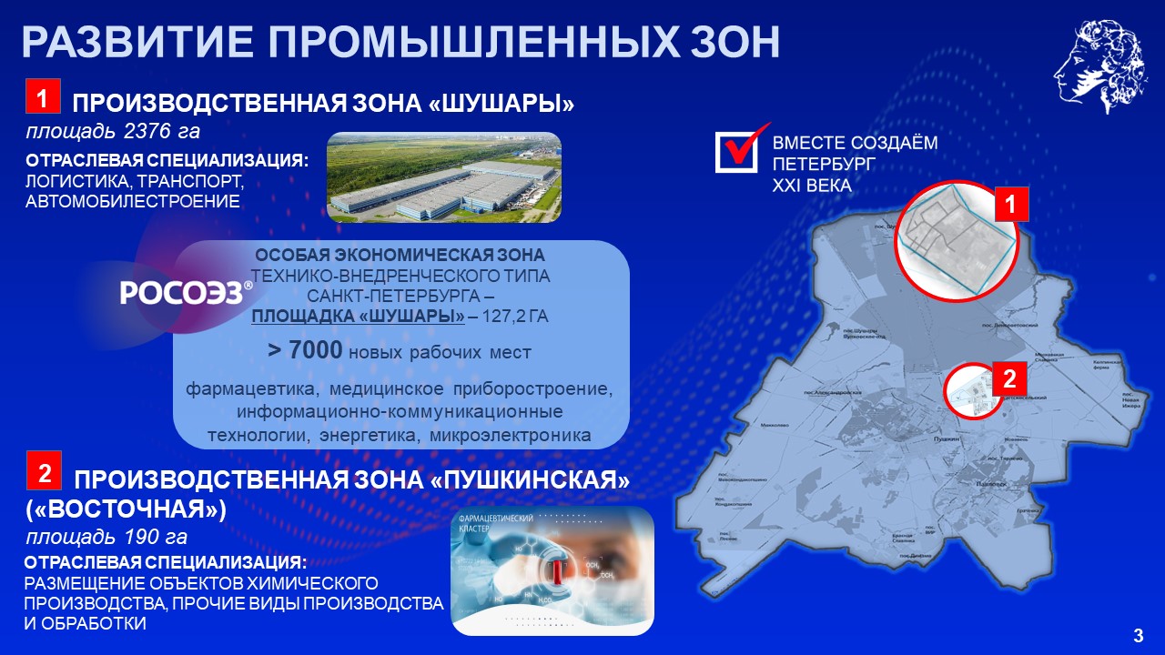 Губернатор подчеркнул, что город Пушкин и Пушкинский район можно назвать «малым Петербургом». Здесь находятся памятники мирового значения, научные институты, высокотехнологичные предприятия и крупные жилые комплексы. Сегодня район становится одним из главных центров развития Петербурга.