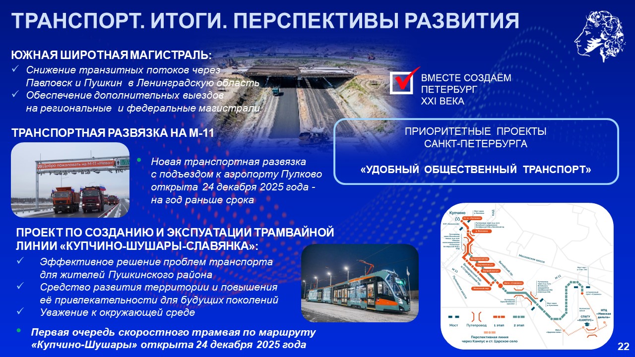 Александр Беглов также отметил важность улучшения транспортной Пушкинского района. Пушкин и Павловск стали первыми направлениями, где в 2022 году было введено тактовое движение электричек. По поручению Президента России ведётся строительство скоростной трамвайной линии от станции метро «Купчино» до Славянки, уже открыто движение до Шушар. Пассажиропоток составляет более 9 тысяч человек в день. В планах на этот год – полностью открыть движение до Славянки.