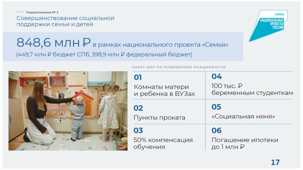 Так, для семей с детьми в 2025 году были организованы бесплатные пункты проката предметов первой необходимости для новорождённых во всех районах, расширены услуги социальной няни. В вузах открыты комнаты матери и ребёнка. Студенткам очных отделений предоставляется единовременная выплата по беременности в размере 100 тысяч рублей – в прошлом году их получили 346 петербурженок. Многодетные семьи получают компенсацию в размере 50% от стоимости обучения ребёнка в вузе или колледже. При рождении третьего и последующих детей - выплату на погашение ипотечных кредитов до 1 млн рублей.