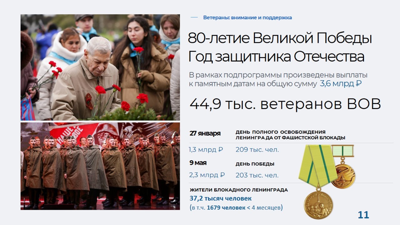 В 2025 году различные меры социальной поддержки получили более 2 млн горожан. В частности, в рамках празднования 80-й годовщины Победы в Великой Отечественной войне выплату в повышенном размере получили около 203 тысяч человек - ветераны, блокадники, вдовы погибших инвалидов и участников войны, несовершеннолетние узники фашизма, дети войны.