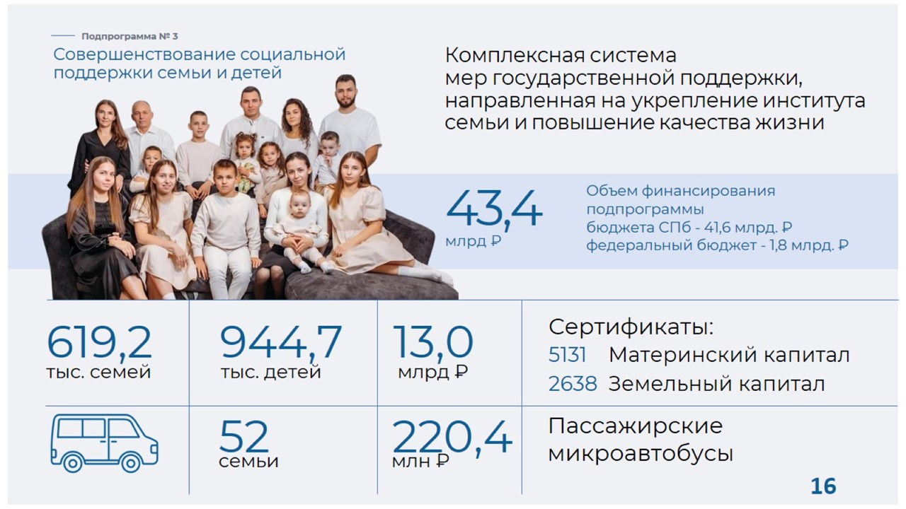«Петербург всегда был и остается социально ориентированным городом. На протяжении всех последних лет мы выполняем программу социальной поддержки граждан со стабильно высоким показателем. По итогам прошлого года он вплотную приблизился к ста процентам, – подчеркнул глава города. — Расходы на нашу главную социальную программу ежегодно растут. В прошлом году выделили почти 170 млрд рублей – на 35 млрд больше, чем годом ранее. На 2026 год на выполнение программы выделено порядка 187 млрд рублей. Это не просто цифры. За ними – качественное улучшение жизни семей с детьми, ветеранов и блокадников, маломобильных горожан, петербуржцев «серебряного возраста», участников специальной военной операции и их семей».