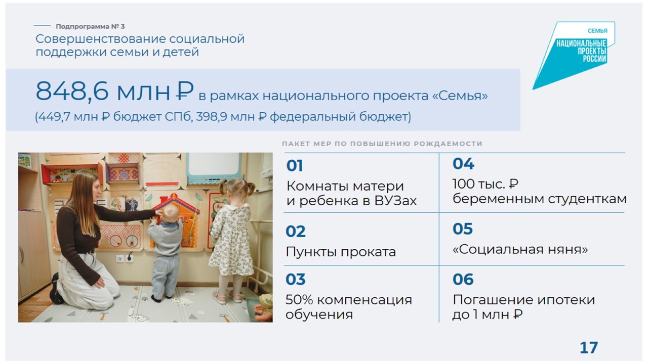В рамках реализации госпрограммы Санкт‑Петербурга в 2026 году запланировано введение единовременной выплаты в размере 200 тысяч рублей при рождении ребёнка в студенческих семьях петербуржцев. Продолжится расширение сети «Серебряных центров».