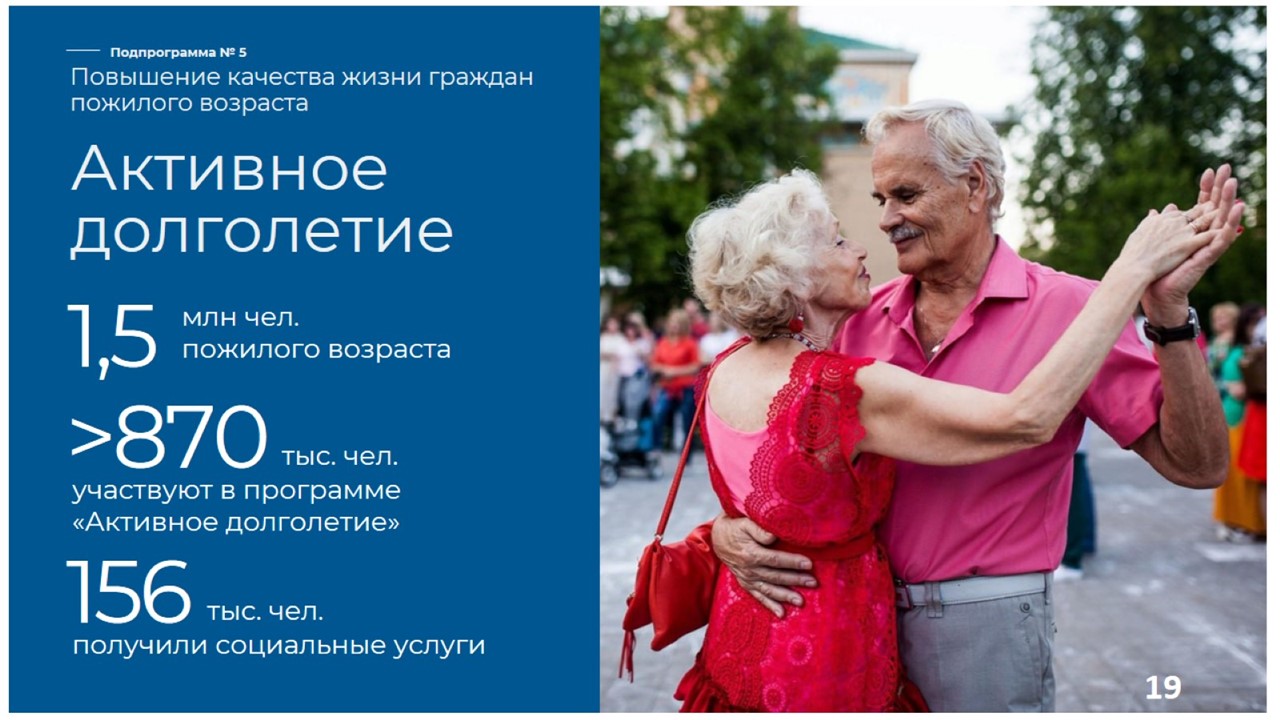 Благодаря проекту «Серебряный возраст» расширены возможности получения высокотехнологичной медицинской помощи. Открыты центры профилактики «Территория здоровья» и Центр женского здоровья для женщин старше 50 лет. Увеличены объёмы бесплатного слухопротезирования и лечения катаракты. Расширена сеть спортивных и досуговых учреждений.