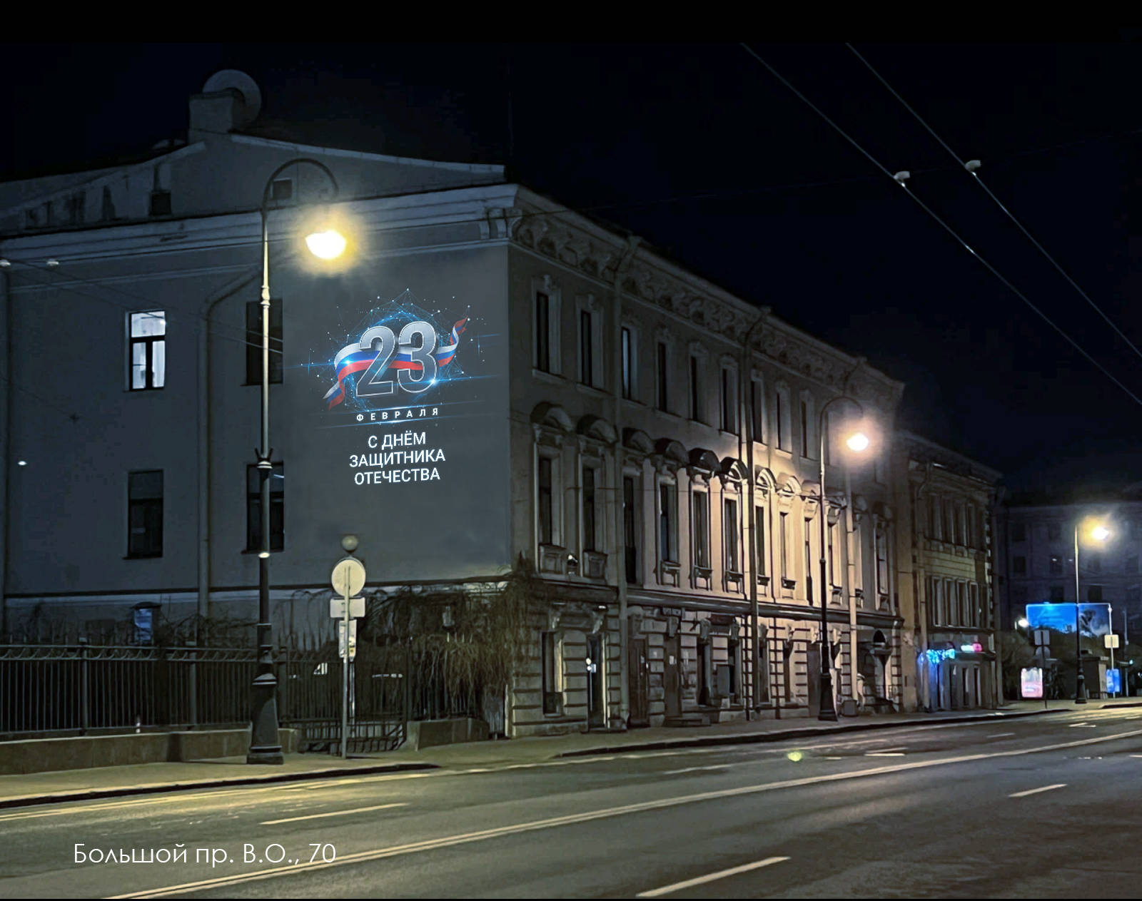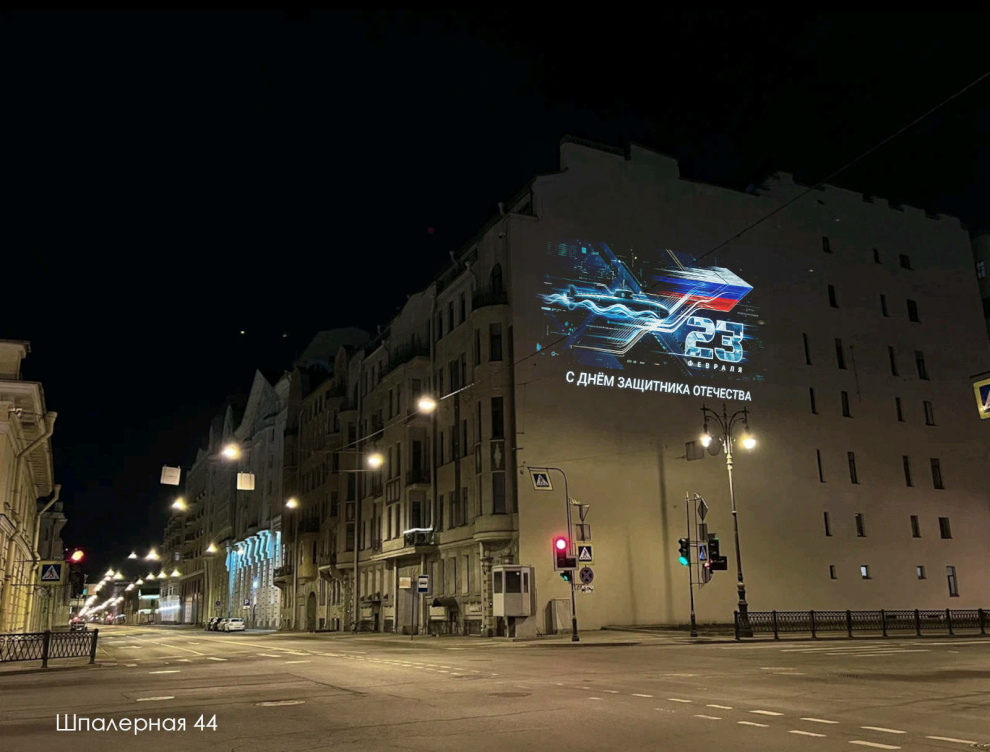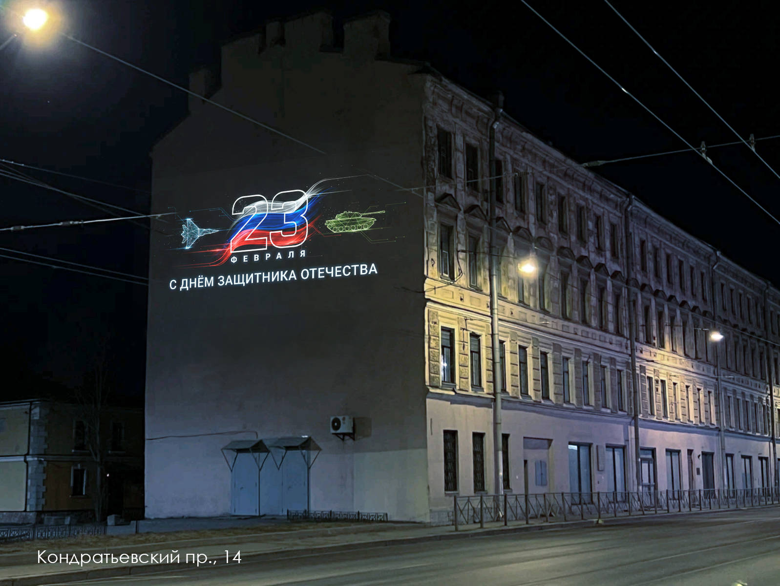 Сегодня вечером на фасадах зданий в семи районах города появятся световые проекции, посвящённые Дню защитника Отечества. Они будут включаться ежедневно вместе с городским вечерним освещением с 20 по 23 февраля в Пушкинском, Московском, Адмиралтейском, Центральном, Петроградском, Василеостровском и Петродворцовом районах.
