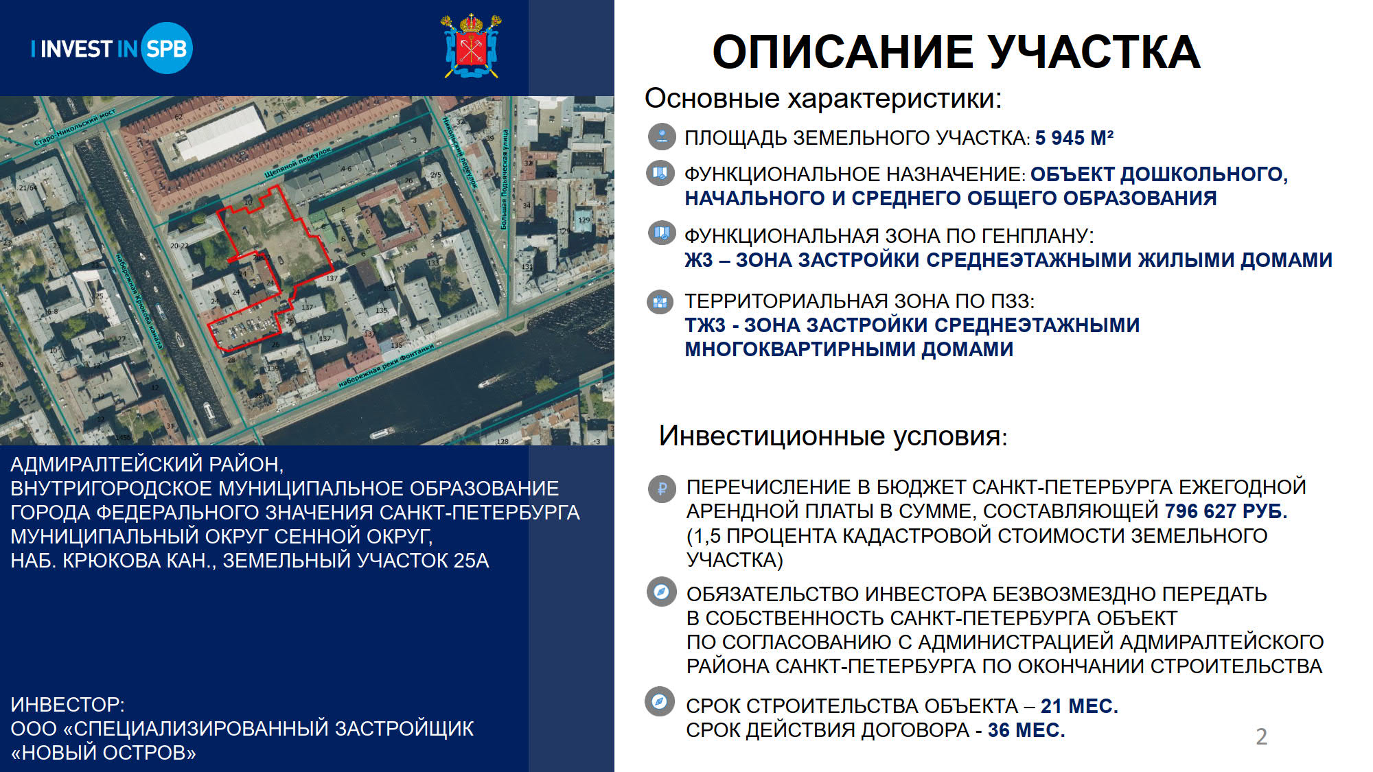 Срок строительства детского сада – 21 месяц со дня заключения договора аренды земельного участка на инвестиционных условиях. Срок действия договора – 36 месяцев. Плановый срок ввода объекта в эксплуатацию – июнь 2027 года. По окончании строительства инвестор безвозмездно передаст детский сад в собственность Петербурга.