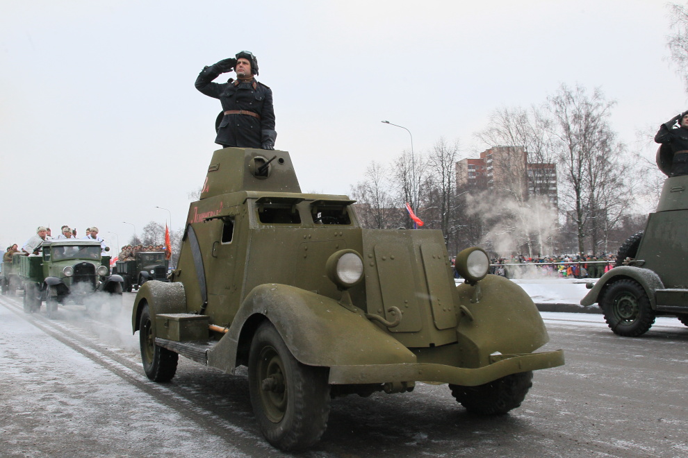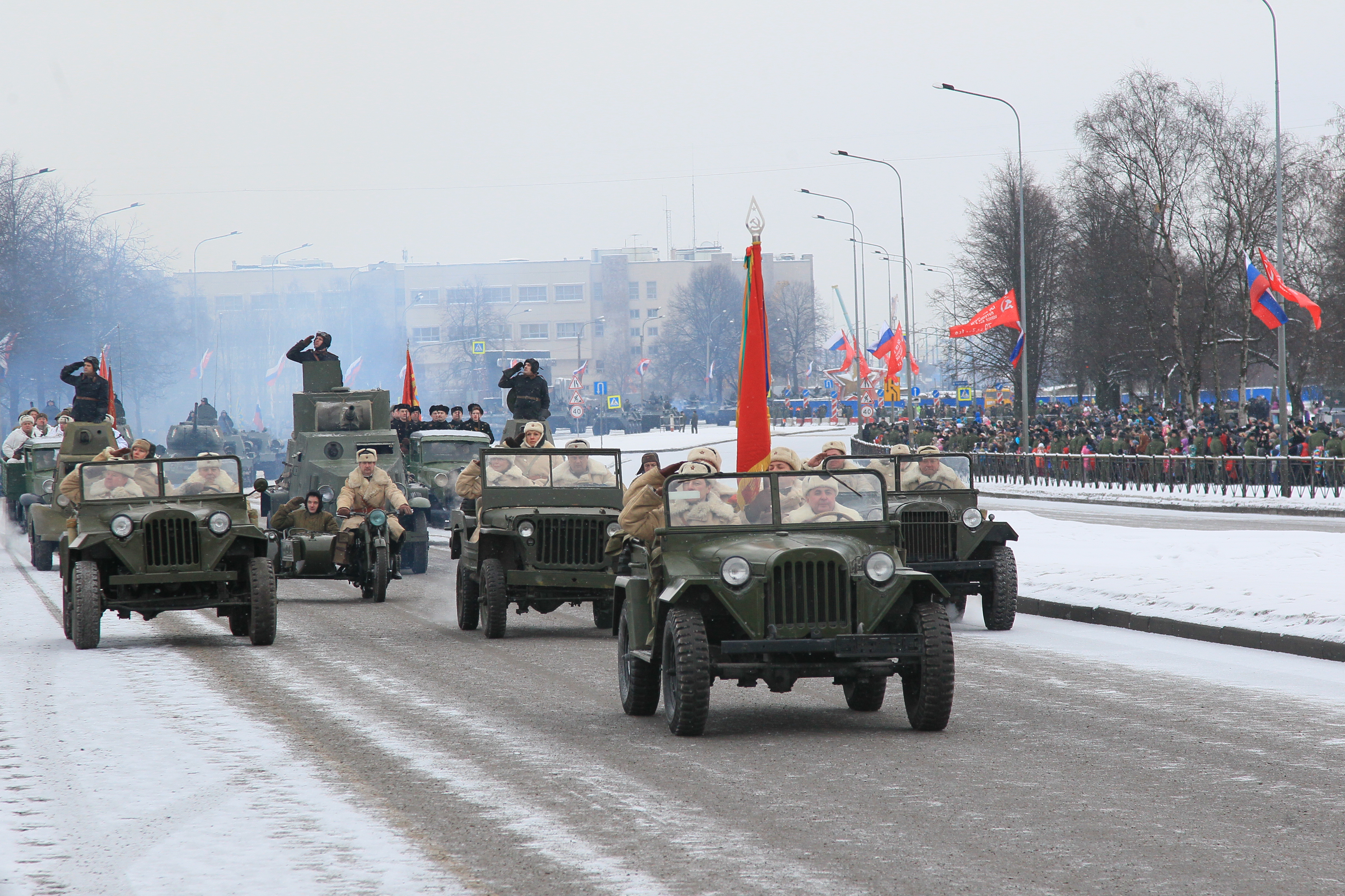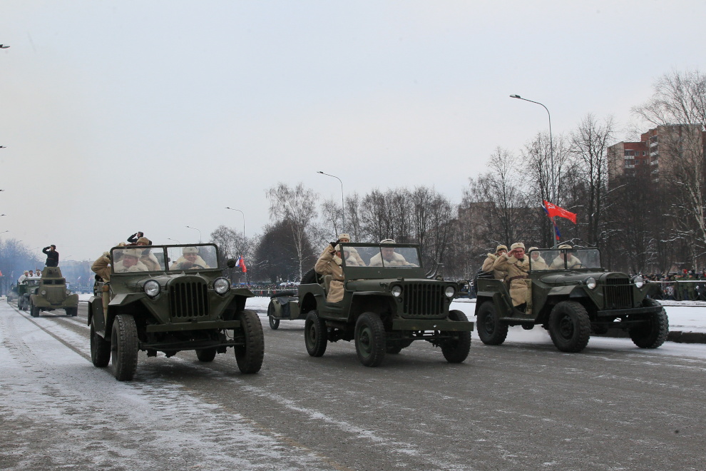 Во главе парадных расчетов были пронесены знамена фронтов и флотилий, освобождавших Ленинград. В параде приняли участие военнослужащие Санкт‑Петербургского гарнизона, курсанты военных учебных заведений. В парадном строю прошли легендарные танки «Т-34», знаменитые «полуторки», а также современная боевая техника.