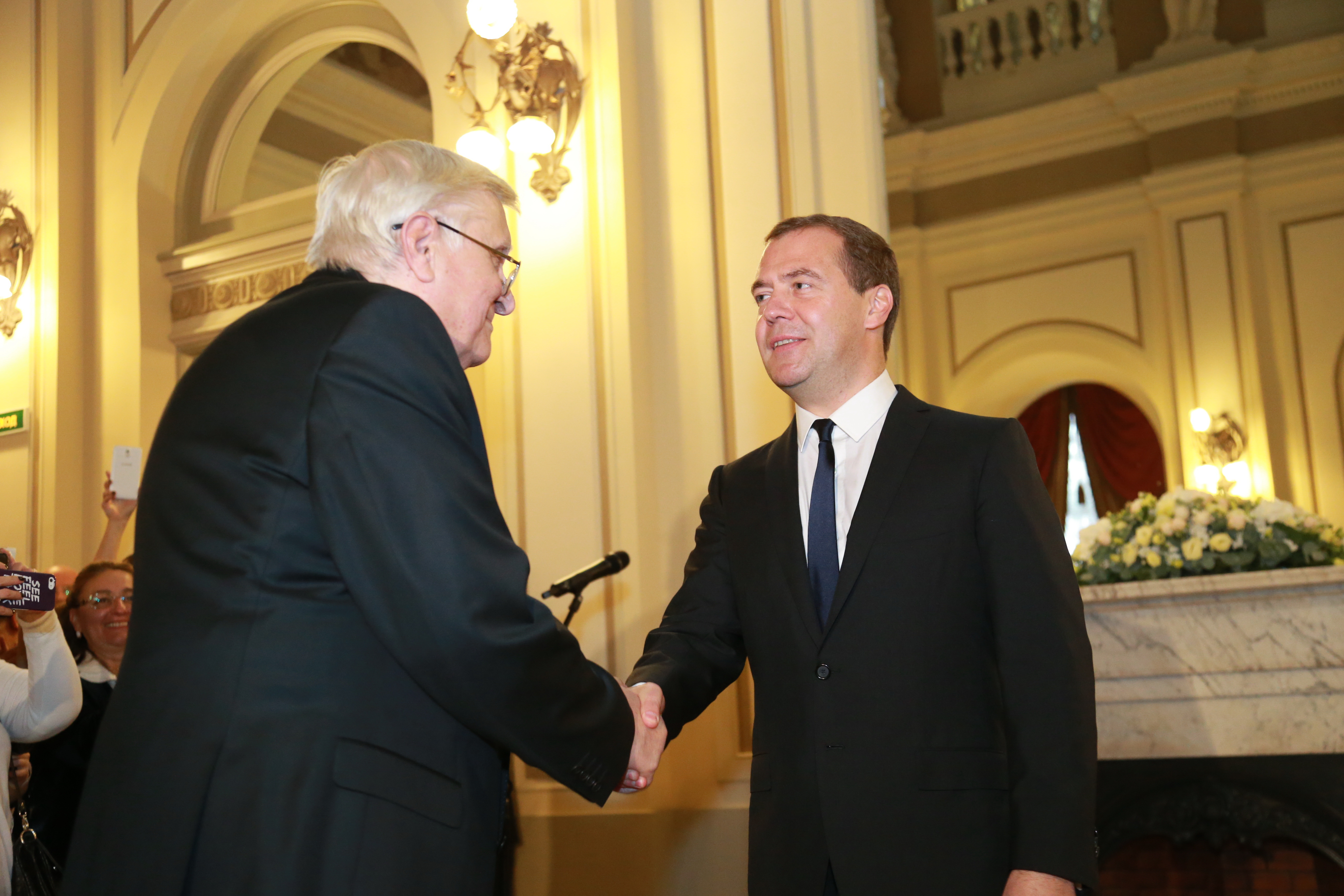 Дмитрий Медведев поздравил коллектив театра с возвращением в историческое здание. Также председатель Правительства РФ вручил Орден Почета ведущим актерам театра Олегу Басилашвили, который в эти дни отмечает свой юбилей, и Алисе Фрейндлих.