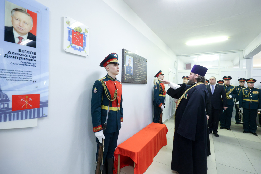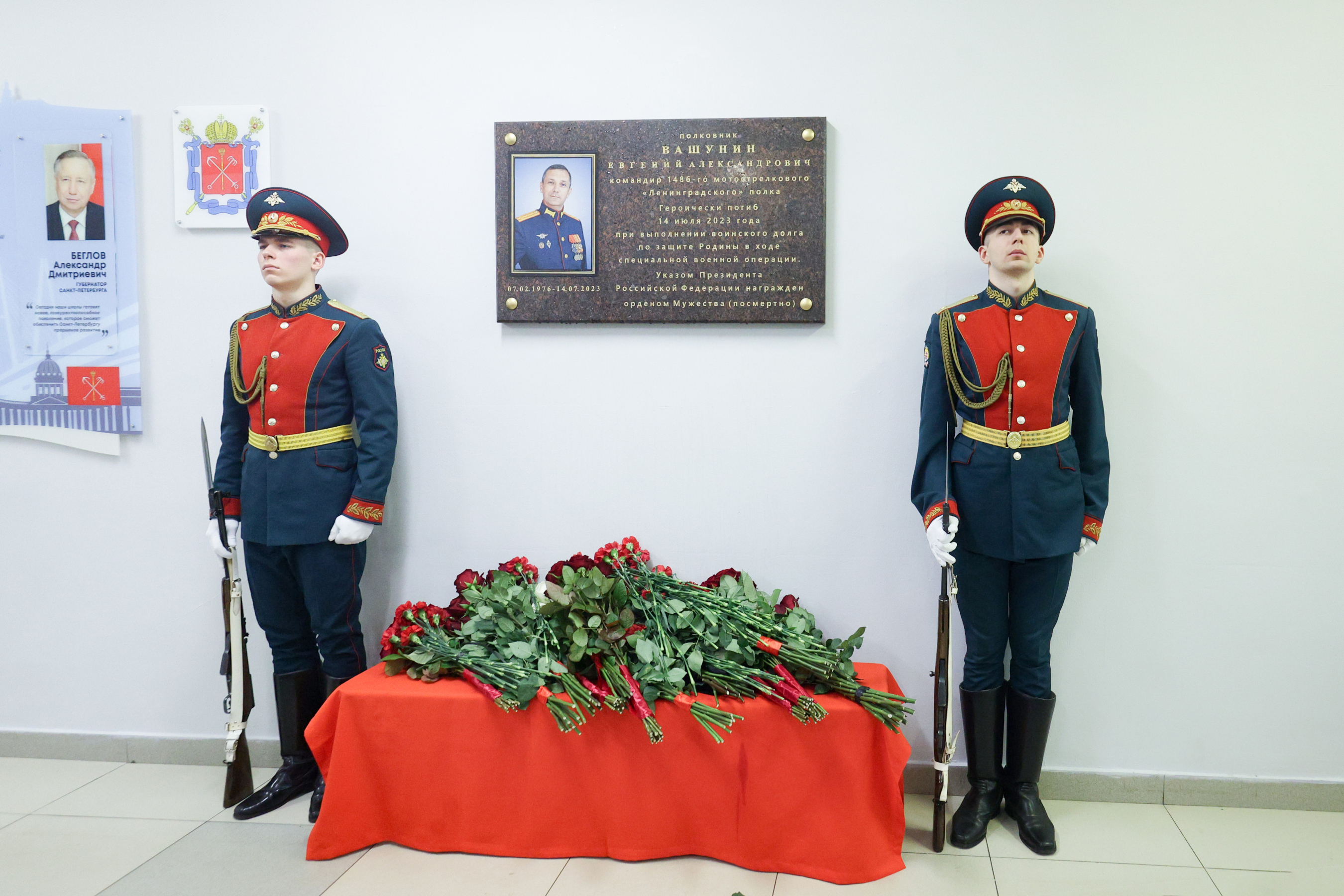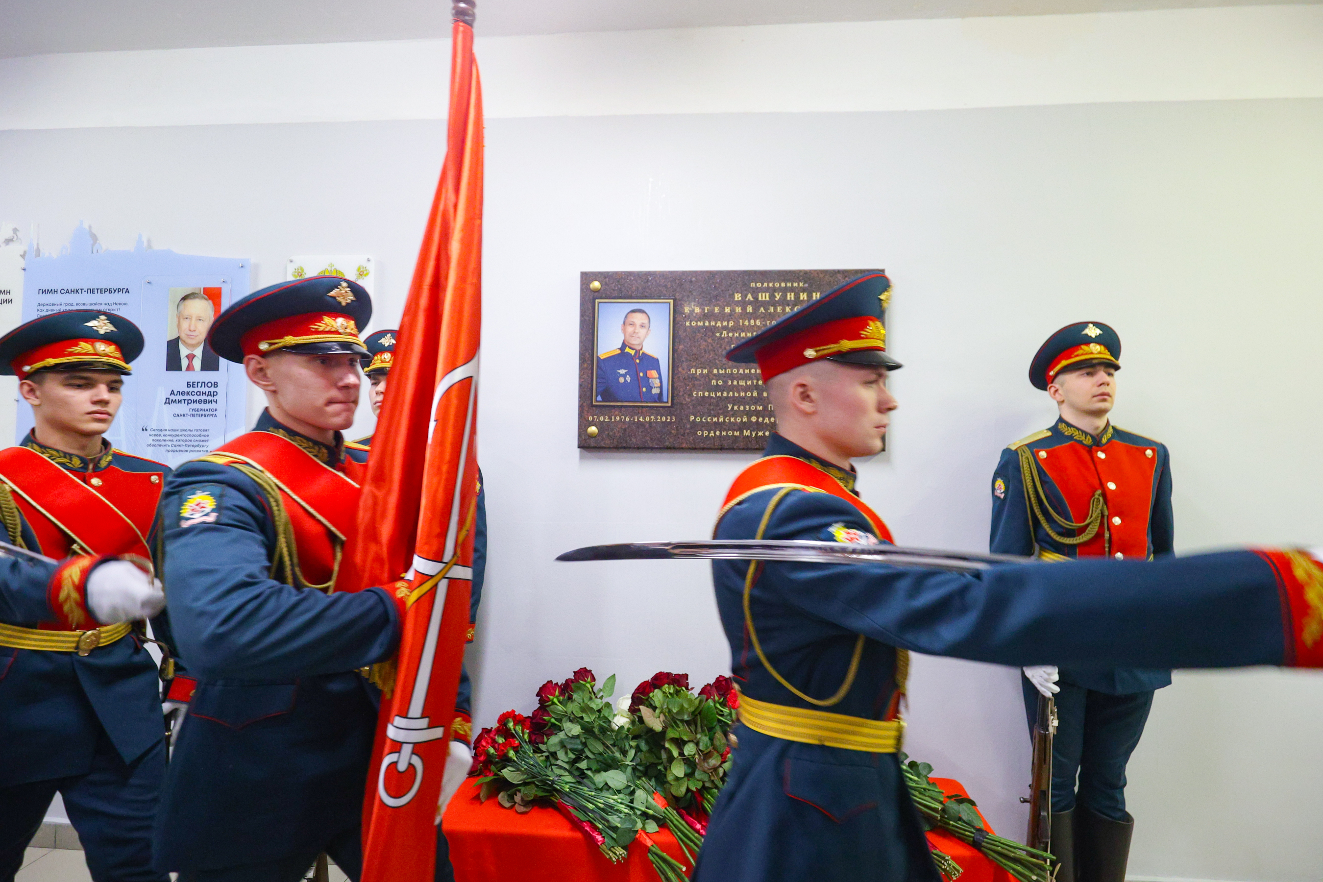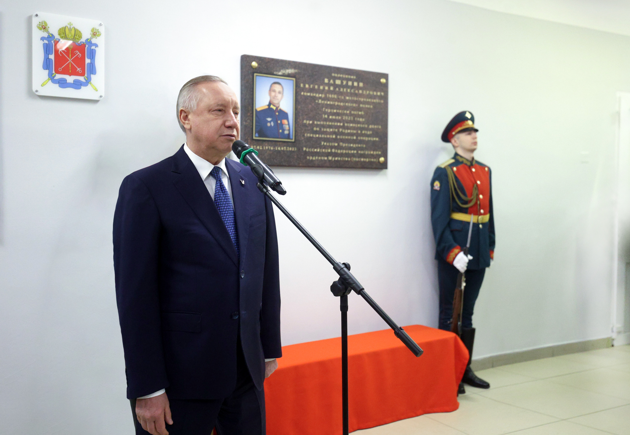 Александр Беглов принял участие в торжественной церемонии открытия памятной доски первому командиру Ленинградского полка полковнику Евгению Александровичу Вашунину в школе № 16