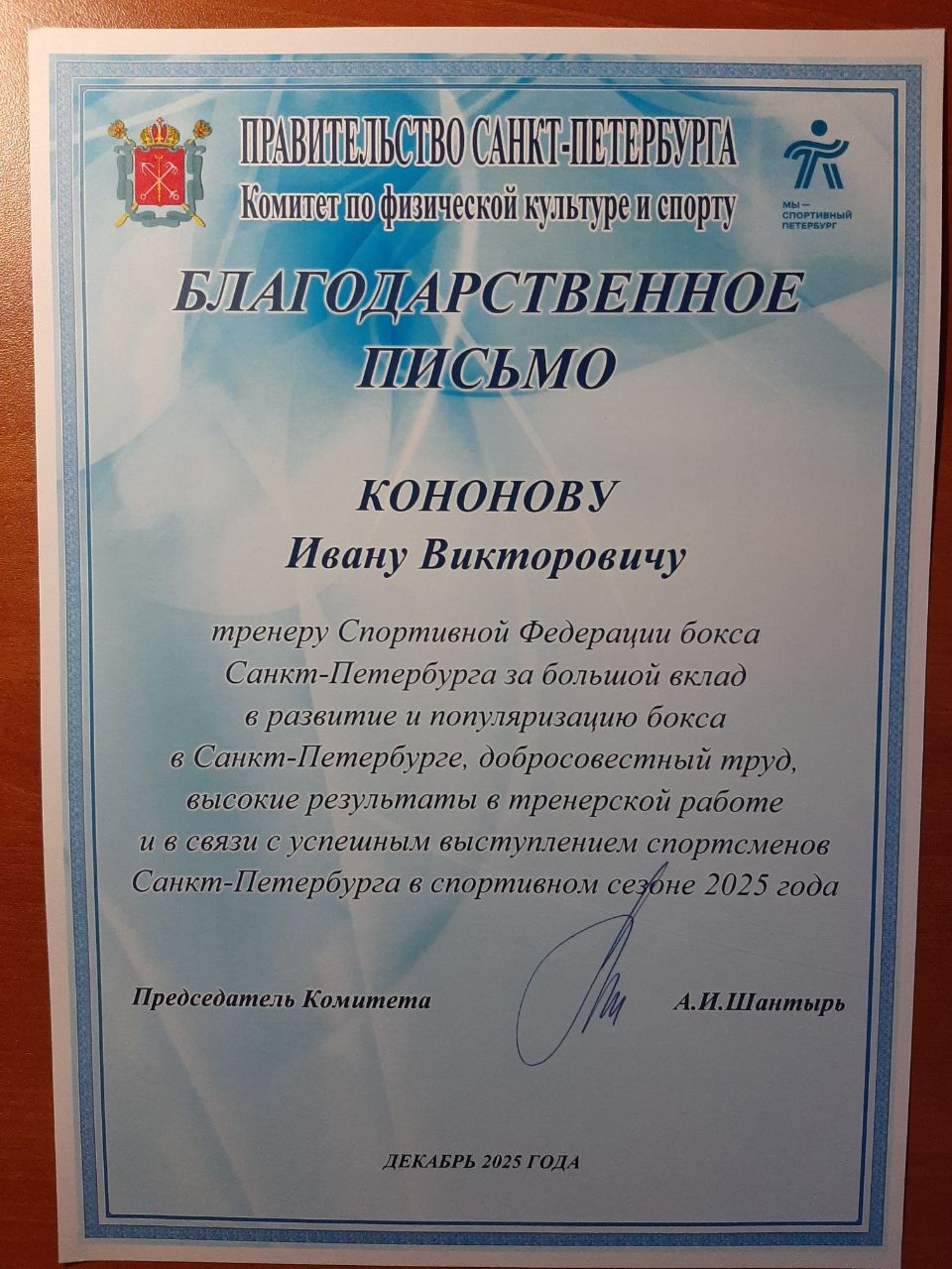 Тренер Выборгского района был признан лучшим тренером федерации бокса Санкт‑Петербурга по итогам работы 2025 года