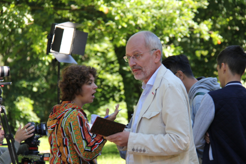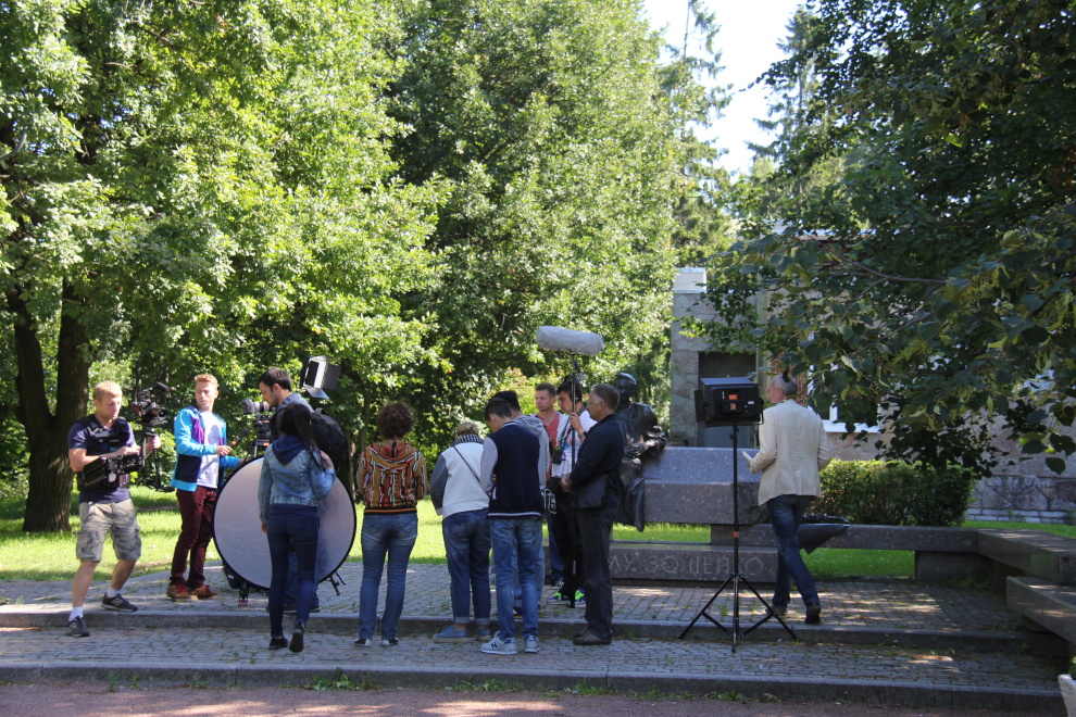 Телевизионные съемки в сквере у памятника М.Зощенко