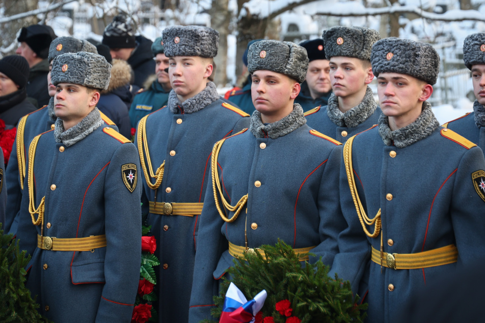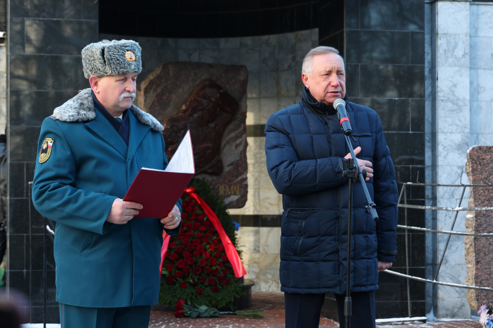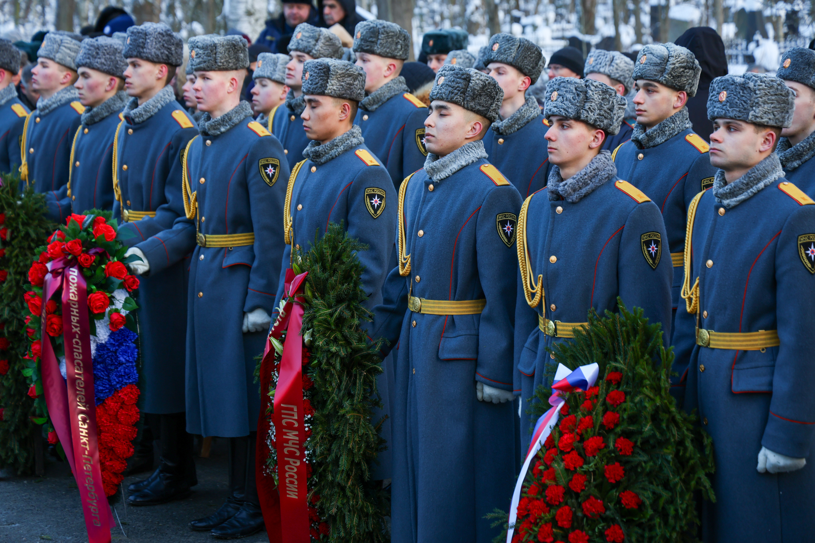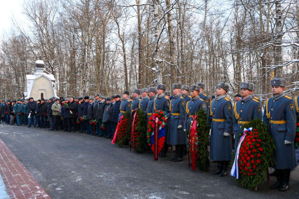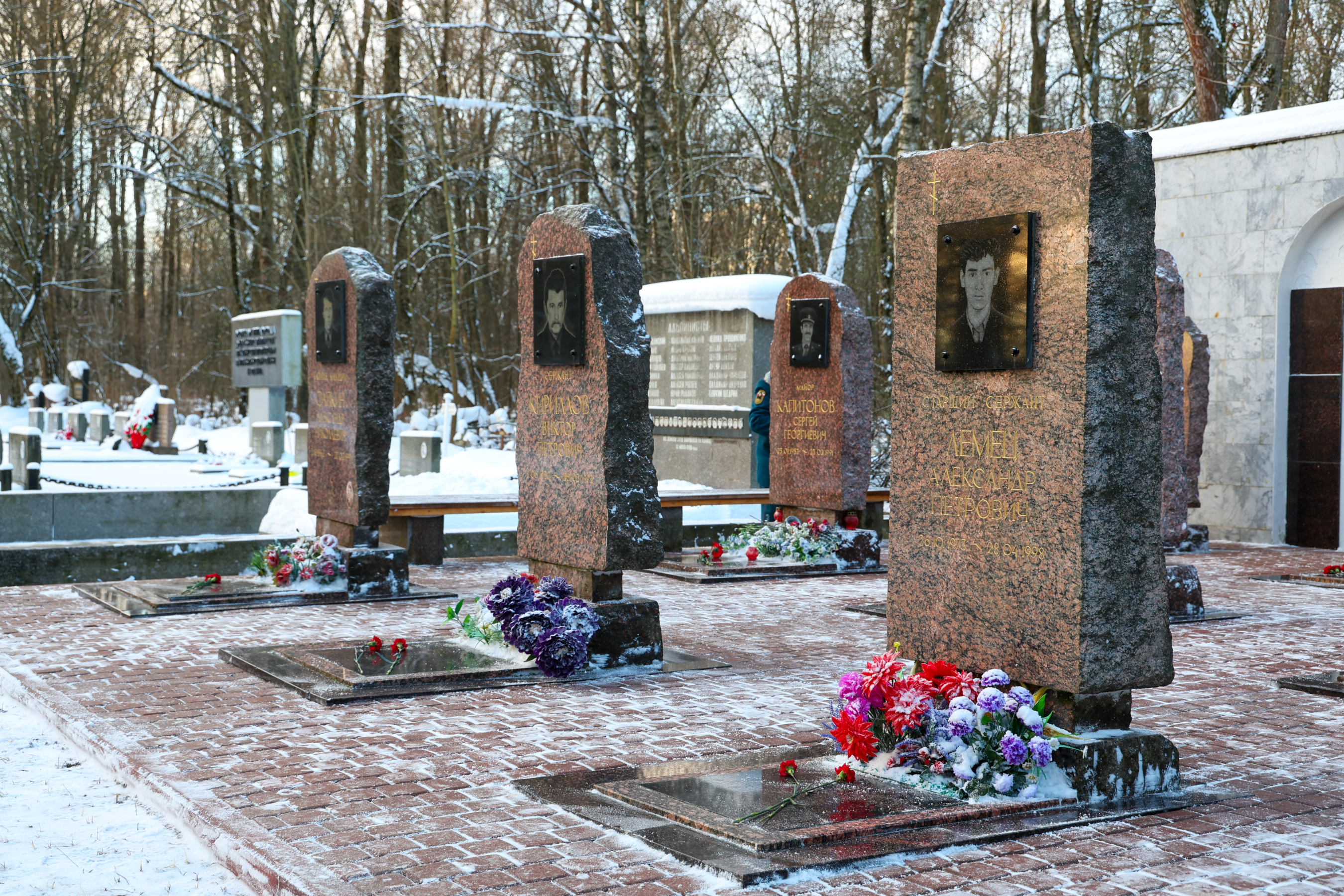 Торжественно-траурная церемония на Серафимовском кладбище в 35-ю годовщину со дня гибели девяти ленинградских пожарных при тушении огня в гостинице «Ленинград»